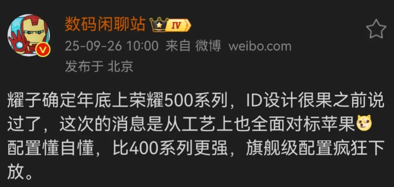 荣耀500系列档期确定,“果味十足”是不是你的菜? 据站哥爆料:荣耀500系列确定年底发布,比预期11月稍微晚点。荣耀500搭载骁龙8s Gen3,荣耀500Pro则是骁龙8 Elite,与Magic7系列同款,主打中屏2亿大底影像; 荣耀500相比400更强,荣耀这是要放大招,对标苹果意味着工艺和设计上会有更多创新,加上旗舰配置下放,500系列可能会成为性价比之王,成为下一个销量300万的产品,大家说有没有没可能?