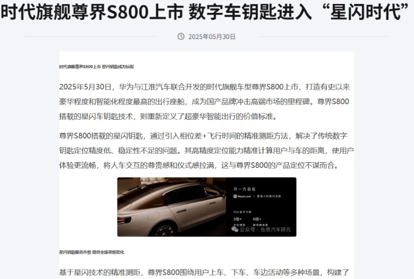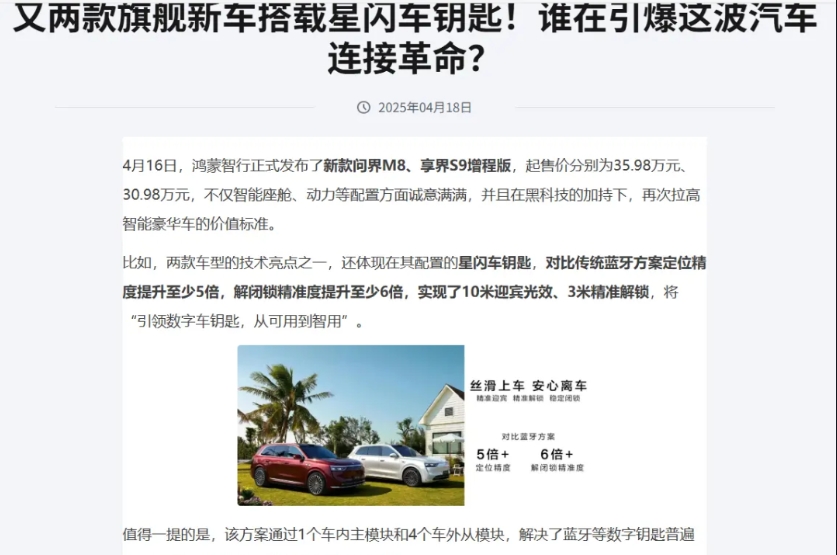 比如,鸿蒙智行旗下多款旗舰新车搭载星闪车钥匙,对比传统蓝牙方案定位精度提升至少5倍,解闭锁精准度提升至少6倍,实现了10米迎宾光效、3米精准解锁,成为了新车买点,并为消费者带来更好的体验。