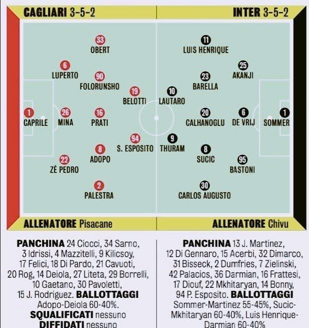 难猜!意甲第五轮国际米兰客场挑战卡利亚里首发阵容各大媒体报道出入很大! 就在刚刚,米兰体育报更新国际米兰首发阵容,352阵型中,多处位置做出调整!我们可以对比天空体育的预测看一下! 1. 门将位置都是索默回归主力! 2. 三中卫:米体预测巴斯托尼-德弗里-阿坎吉,而天空体育预测的是阿切尔比首发; 3. 三中场:米体预测巴雷拉-恰尔汗奥卢-苏西奇,而天空体育预测巴雷拉-恰尔汗奥卢-姆希塔良; 4. 两翼:米体预测迪马尔科+亨里克,天空体育预测维持不变迪马尔科+达米安; 5.双前锋:米体和天空都预测劳塔罗+图拉姆! 所以在三中卫,三中场和两翼的预测都有出入,主要是阿切尔比/德弗里,苏西奇/姆希塔良,达米安/亨里克这三个位置目前很难说,甚至米体连索默的首发都预测55%,微弱优势压过何塞普·马丁内斯! 这个也是好事情,相比小因扎吉用人太容易被预测,齐沃最起码有不可预测性,小将们获得的机会也会更多,成长更快,更快出成绩!
