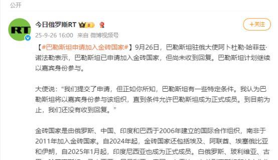 巴勒斯坦正式宣布了! 巴勒斯坦刚攒够157个国家的“认可票”,转天就干了件实在事——9月26号,它驻俄罗斯的大使阿卜杜勒直接说,已经正式申请加入金砖国家组织了。 这步操作不绕弯子,明显是借着国际社会认账的势头,找个能实打实帮上忙的“大平台”。 其实不难想,巴勒斯坦为啥急着找金砖。157国承认它的身份,相当于在国际上“站稳了脚”,但光有身份不够,发展才是正经事。 巴勒斯坦现在啥处境?加沙地带的经济体系已经彻底崩溃。2024年,加沙的GDP直接跌没了82%,失业率高达80%,贫困率快赶上80%了。联合国报告说,加沙的发展水平直接倒退了69年,人类发展指数退回到1954年的水平。超市货架空了,医院缺医少药,学校被炸得稀巴烂。这种情况下,巴勒斯坦急需外部援助和经济合作。 金砖国家是个啥概念?这是全球最大的新兴市场国家合作平台,成员包括中国、俄罗斯、印度、巴西、南非,还有沙特、伊朗这些新加入的中东产油大国。金砖国家人口占世界一半,经济总量占全球30%,贸易额占1/5。 更关键的是,金砖国家有新开发银行,能给发展中国家提供低息贷款和项目投资。比如埃及加入金砖后,就拿到了新开发银行的基建贷款,建了不少发电厂和港口。 巴勒斯坦加入金砖,能得到啥好处?首先是经济援助。新开发银行可以给巴勒斯坦提供重建资金,帮助修复被炸毁的医院、学校和住房。 其次是贸易合作。金砖国家内部正在推动本币结算,减少对美元的依赖。巴勒斯坦如果加入,就可以用本国货币和其他成员国做生意,降低汇率风险。 再者是技术转移。中国在新能源、农业科技等领域有先进技术,俄罗斯在军工、航天方面实力雄厚,这些技术都可以通过金砖合作平台转移到巴勒斯坦。 但加入金砖也不是那么容易的事。金砖国家在2024年6月决定暂缓扩员,把重点放在整合现有新成员上。要加入金砖,得先成为对话伙伴国,然后逐步满足一系列条件,比如不参与美西方的单边制裁。不过,巴勒斯坦的情况特殊。它是国际社会公认的主权国家,而且长期遭受以色列的军事占领和经济封锁,符合金砖国家支持发展中国家的宗旨。 中国对巴勒斯坦加入金砖的态度很明确。9月26日,外交部发言人表示,金砖国家欢迎志同道合的伙伴参与合作,共同推动国际秩序更加公正合理。 俄罗斯最近在中东动作频频,普京多次访问阿联酋、沙特等金砖新成员,试图扩大在中东的影响力。支持巴勒斯坦加入金砖,可以提升俄罗斯在阿拉伯世界的威望。 美国对巴勒斯坦加入金砖会有啥反应?肯定不高兴。美国一直把金砖国家视为竞争对手,曾威胁对参与“去美元化”的金砖国家加征100%关税。但美国现在忙着应对俄乌冲突和国内经济问题,可能无暇顾及巴勒斯坦的小动作。而且157国承认巴勒斯坦,说明国际社会已经厌倦了美国在巴以问题上的偏袒政策。 巴勒斯坦这步棋走得挺妙。先拿到国际社会的广泛承认,再申请加入金砖,既提升了自身的国际地位,又为未来的发展找到了靠山。不过,加入金砖只是第一步,真正要实现经济复苏和国家重建,还得靠巴勒斯坦人民自己的努力。 来源:今日俄罗斯RT 【巴勒斯坦申请加入金砖国家】 环球时报 【中方是否支持巴勒斯坦加入金砖国家?外交部回应】