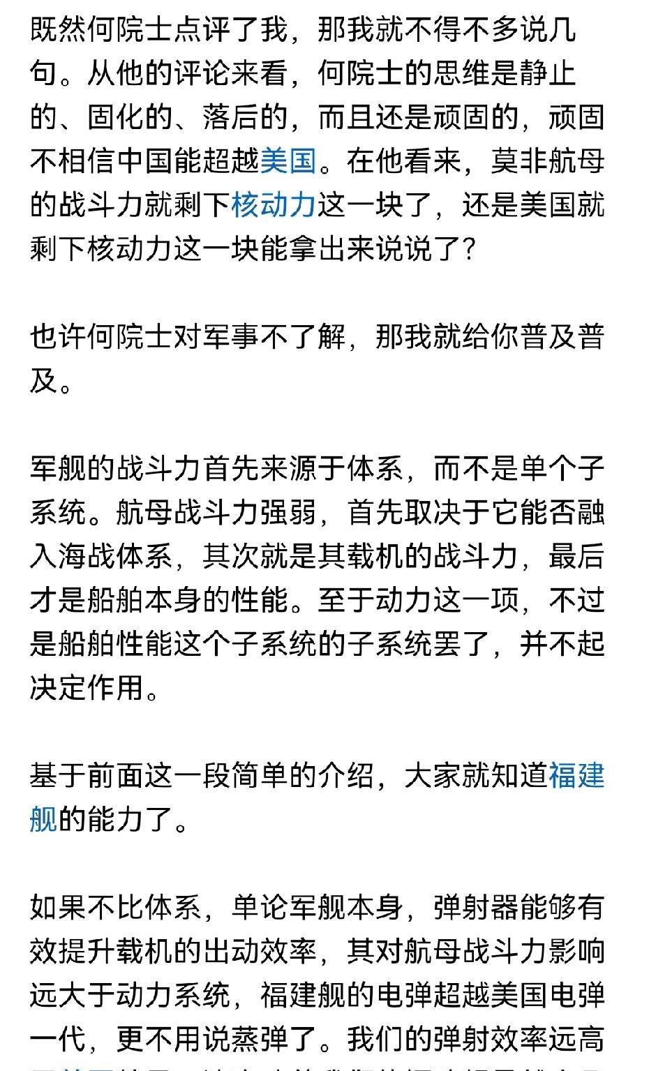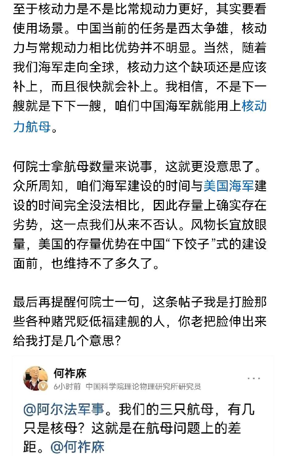 何诈麻被阿尔法反将一军,还问了一个极其犀利的问题,让人百思不得其解 一段时间以来,何院士与立刚口水战你来我往,让我了解到,除了德国煮蛋器的故事,原来老何也有这样的一面,爱斗嘴…… 然而,刚刚,我发现大V阿尔法军事对何院士出手了,这让人百思不得其解,老何是哪头的? 梳理一下事件脉络,阿尔法军事在福建舰弹射成功后,对内涵我们航母能力的的人,做了一个点评。 我看了一下,点评很直接,但也很客观。 没想的是何院士就此艾特阿尔法,意思是我们没核航母,这就是与美军的差距…… 然后,阿尔法军事收到艾特后,反将一军,给老何上了一课的同时,还问了一句:把老脸伸出来给阿尔法打是几个意思? 真不知道,老何如何应对,这么大年龄了,这不是自找没趣吗? 按理来说,那个年代的人爱国是刻在骨子里的,不应该啊,老何反其道而行,几个意思呢?