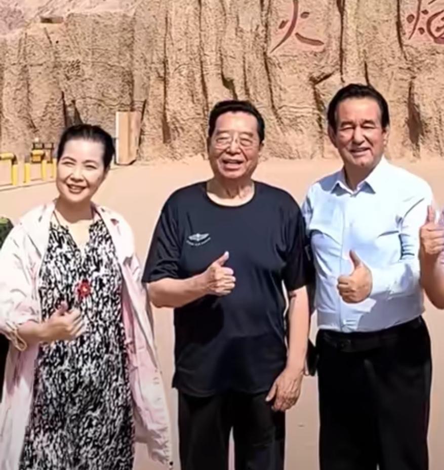 86岁李双江带梦鸽重游新疆,老两口景区合影太温馨![比心] 最近有网友在新疆吐鲁番偶遇李双江和梦鸽了,86岁的老艺术家牵着58岁的妻子逛景区,画面特暖心。这次是他的学生夏米力陪着,一行人去了火焰山,在标志性的温度计雕塑前合了影,李双江还对着镜头竖大拇指,笑得特开心。逛的时候能看出李双江腿脚不太灵便,得有人扶着,但精神头很足,路过开阔处还和学生唱起了早年在新疆唱的歌,声音依旧洪亮。其实新疆对他意义不一般,1963年他刚毕业就分配到新疆军区文工团,这儿算是他音乐事业的起点。景区里有爱心造型的座椅,老两口特意凑过去拍了张照,梦鸽一直挨着他,眼神里全是关切。遇到游客求合影,他们也都答应,一点架子没有。