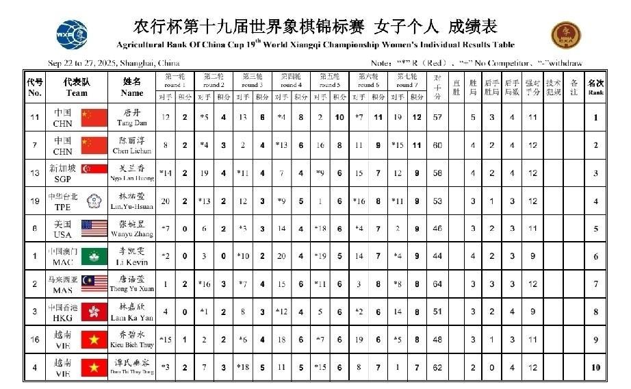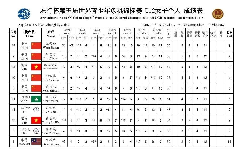 2025世锦赛唐丹夺冠,陈丽淳亚军,团体金牌一起拿下,巾帼不让须眉,男团金牌就看孟繁睿了! 12岁小将也神勇,唐丹队友王紫璇夺冠,获金牌! 16岁组金牌旁落马来西亚,洪千惠确实厉害! 男子金牌旁落越南赖理兄,团体金牌应该有吧? 第八轮排名:尹昇13分赖理兄13分孟繁睿13分阮成保11分,中国队领先2分! 第九轮:赖理兄战胜尹昇,赖理兄就15分了,孟繁睿对冯家俊,吴宗翰对阮成保(就看孟繁睿,如果能赢,中国队就团体夺冠!)中国队,加油!