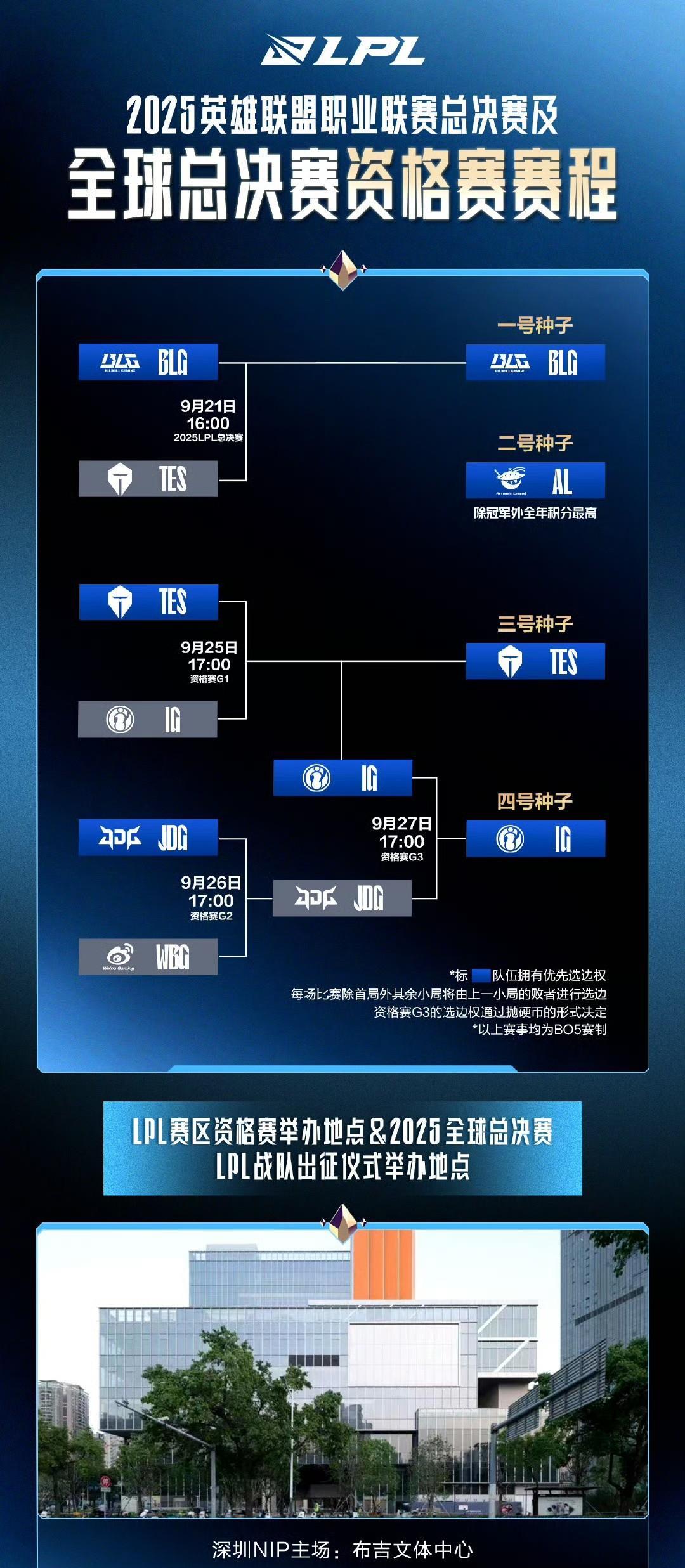 二号种子:AL,积分第一 三号种子:TES,内战幻神 四号种子:IG,全神班集结 好消息:LPL四支队伍确定晋级2025全球总决赛。 坏消息:LPL四号种子IG要先和T1打一场bo5,胜者晋级正赛,败者直接17强回老家! #LPL# #2025lpl#