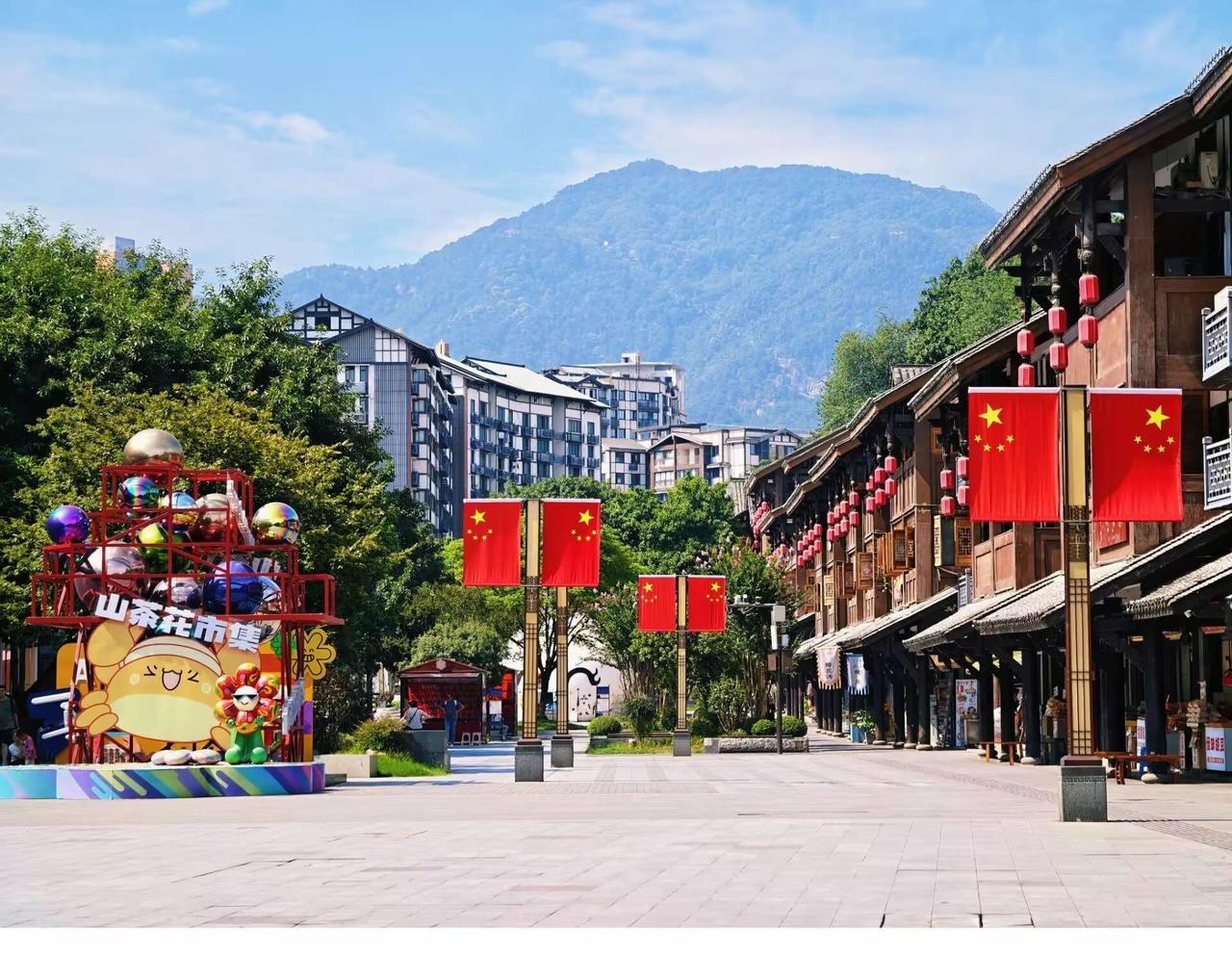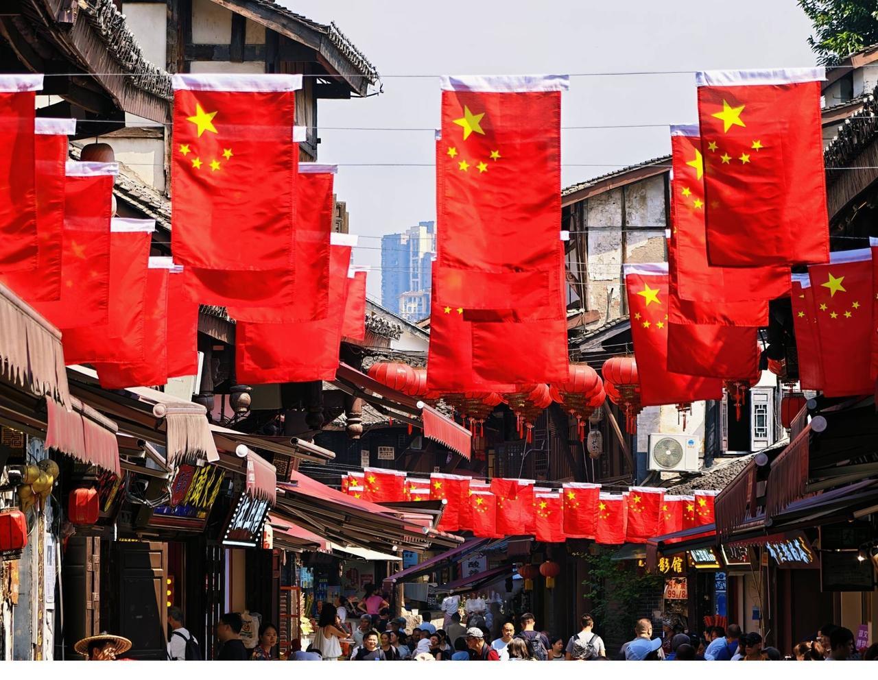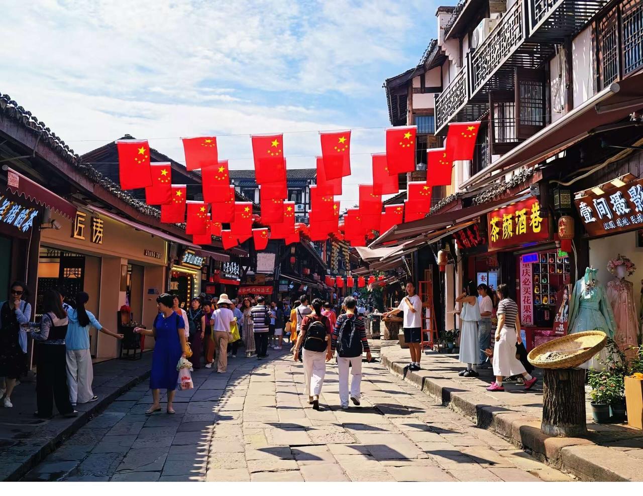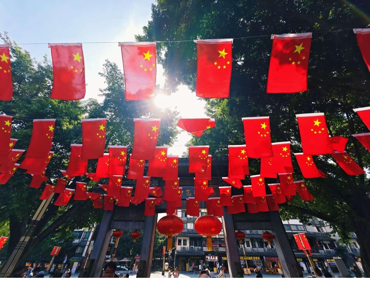 太美啦!9月27日,蓝天白云下的重庆磁器口古镇,挂满了国旗,国庆节气氛热烈,在阳