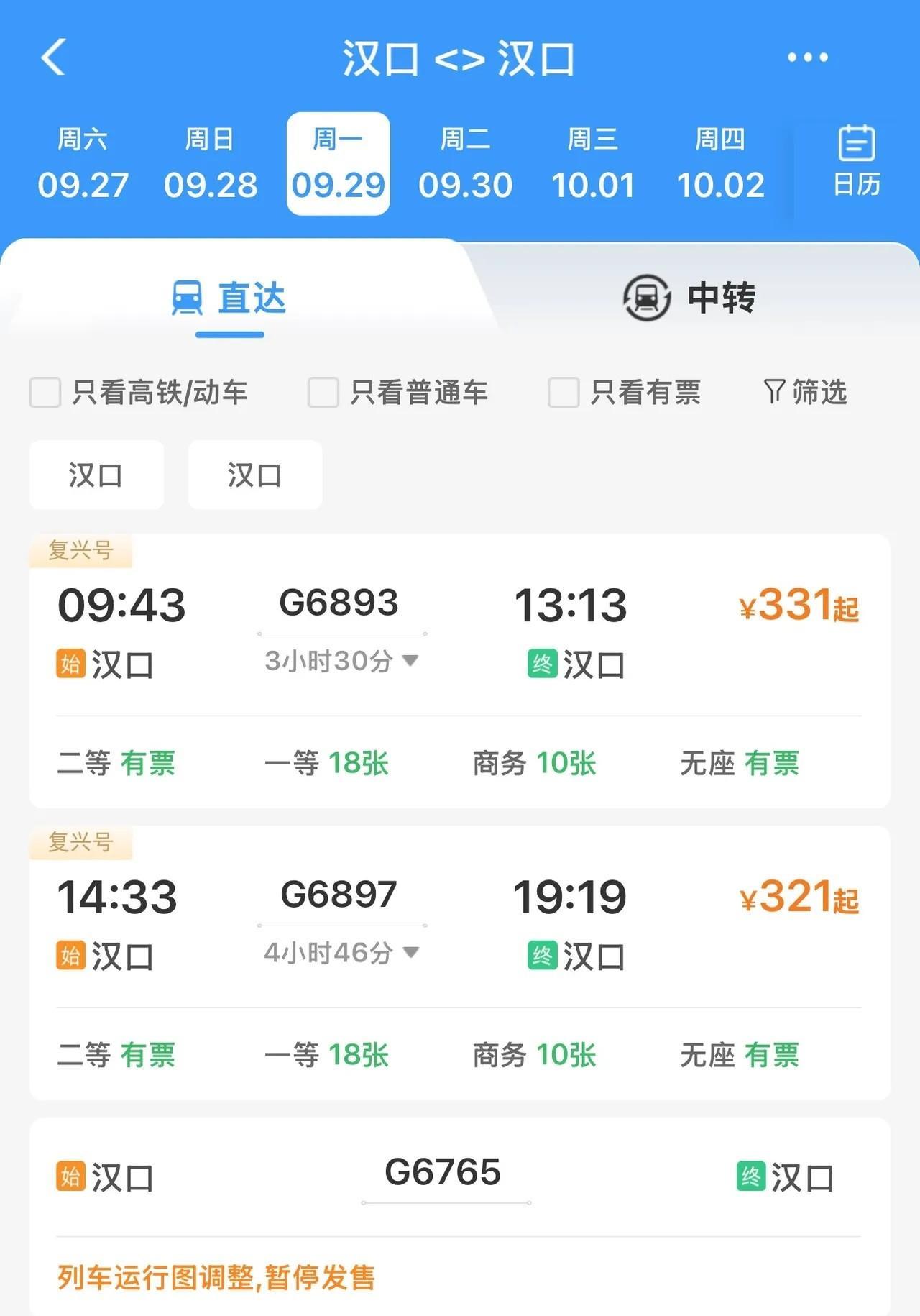 汉口至汉口!湖北首条环线高铁开始卖票了! 从12306看到,湖北环线高铁的票已经开卖了,9月28日开通运营,从汉口到汉口,汉口出发,途径孝感、随州、襄阳、荆门、荆州等城市最后返回汉口,时间3至5个小时。 适逢十一假期,这次有想省内旅游或回家探亲的方便了,原来有些需要换乘的线路这次可以直达了,真是方便了省内交通。 真没想到武汉的环线地铁12号线还没运营 ,环线高铁先来了,环线高铁的开通你感觉有意义没?#分享城市新鲜事#