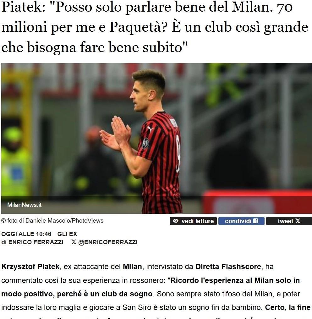 期待米兰战胜那不勒斯!前米兰球员皮亚特克接受采访表示我从来没有怪过米兰,可以加盟米兰是一生的荣耀,我永远都会以积极的方式回忆我的米兰经历。我从小就是米兰球迷,可以穿上米兰球衣代表米兰比赛,这就是一个孩子的梦想成真,这已经足够了。 针对米兰与那不勒斯之战,我记得那场精彩的意大利杯之战,我梅开二度,米兰二比零战胜那不勒斯,我期待本场比赛米兰获得同样的胜利。我很怀念我在米兰的进球,我在米兰的精彩比赛,我觉得我本来可以表现的更好一些,那时候的经验不足,我加盟米兰的时候太年轻了。 皮双枪属于在错误的时间加入了我们,如果当年的皮双枪是在今年现在的米兰效力那么结果完全不同。其实不仅仅是皮亚特克还有同时期的帕奎塔,他们都是很好的球员,但当时的米兰需要成绩,如果换到这个赛季也许结果会完全不同,一个爱米兰的孩子,现在都不知道混到啥联赛了。