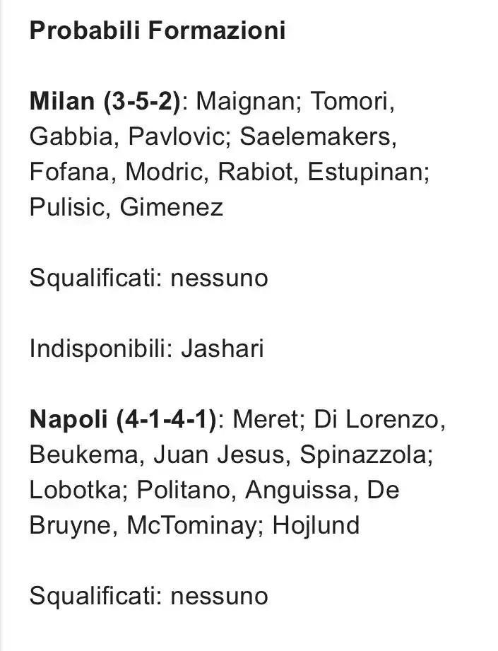 米兰与那不勒斯之战阵容!那不勒斯四后卫边后卫是可以压到底线的,说的就是迪洛伦佐他其实是后卫4里面的变化,最近几场波利塔诺状态不错,我们虽然有两个翼卫,反而边路并不犀利,好在大家都是立足防守,阵地战我们办法不多,那不勒斯没有卢卡库同样办法有限,就看教练如何在关键时刻做出调整了,比如莱奥到底什么时候出场,在中锋位置也一样能突击肋部,包括恩昆库也是肋部突袭高手,不用过多考虑,打那不勒斯就打迪洛伦佐就对了。 米兰:352 门将:迈尼昂 后卫:托莫里、加比亚、帕夫洛维奇 中场:\u0000萨勒马克尔斯、福法纳、莫德里奇、拉比奥特、埃斯图皮尼安 锋线:\u0000希门尼斯、普利西奇 \u0000那不勒斯:4141 \u0000梅雷特 \u0000迪洛伦佐、拉赫马尼、胡安、斯皮纳佐拉 \u0000洛博特卡 \u0000波利塔诺、安古伊萨、德布劳内、麦克托米奈 \u0000霍伊伦德 天空体育:继早安哥受伤缺战米兰,拉赫玛尼的身体状态也未达到最佳,同时昨天那不勒斯报道说迪洛伦佐肌肉也出现了疲劳。现在看不一定是烟雾弹,估计就是有点累。