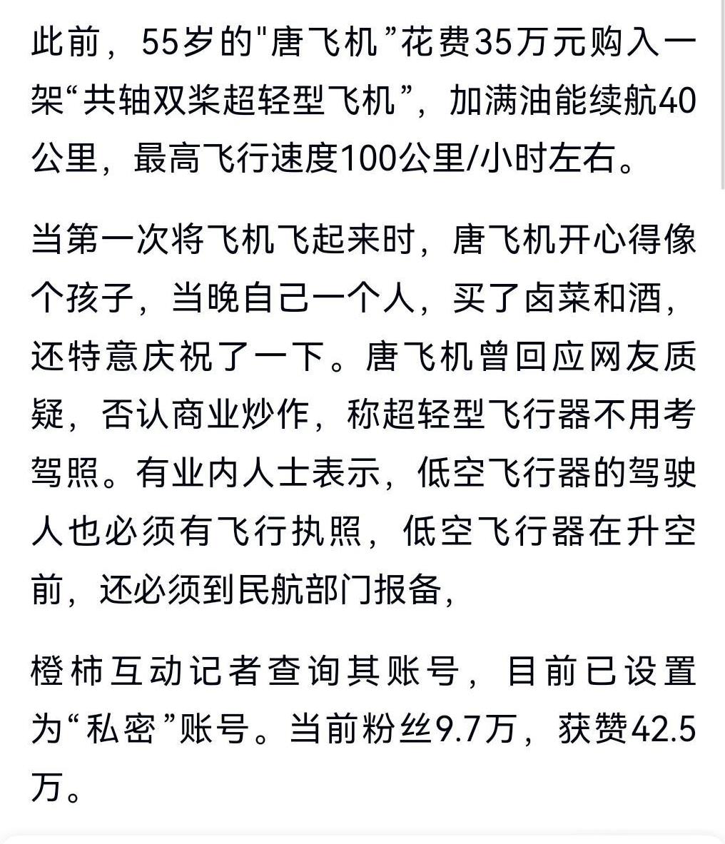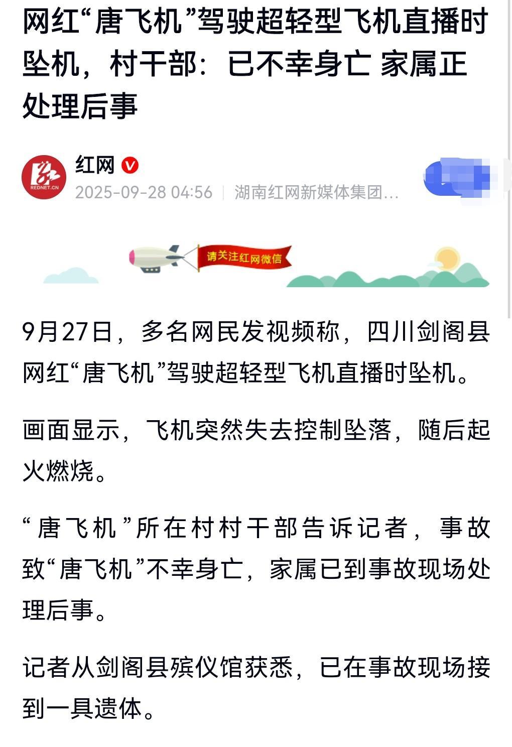 没事玩什么飞机。 这下悲剧了。 9月27日很多网民发布视频称。网红唐飞机直播时坠机身亡。 从他的这个名字来看,看来他是想走驾驶飞行这个赛道。 可这个赛道需要非常专业的能力。 他肯定是不具备的。 这下把命给弄丢了。 这真是敲响了警钟。