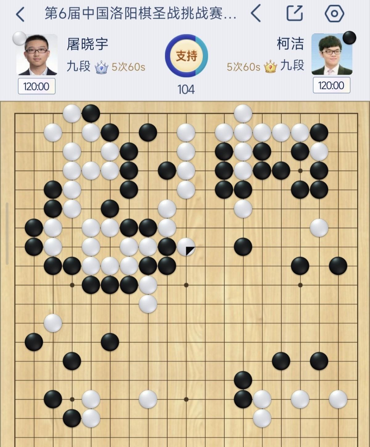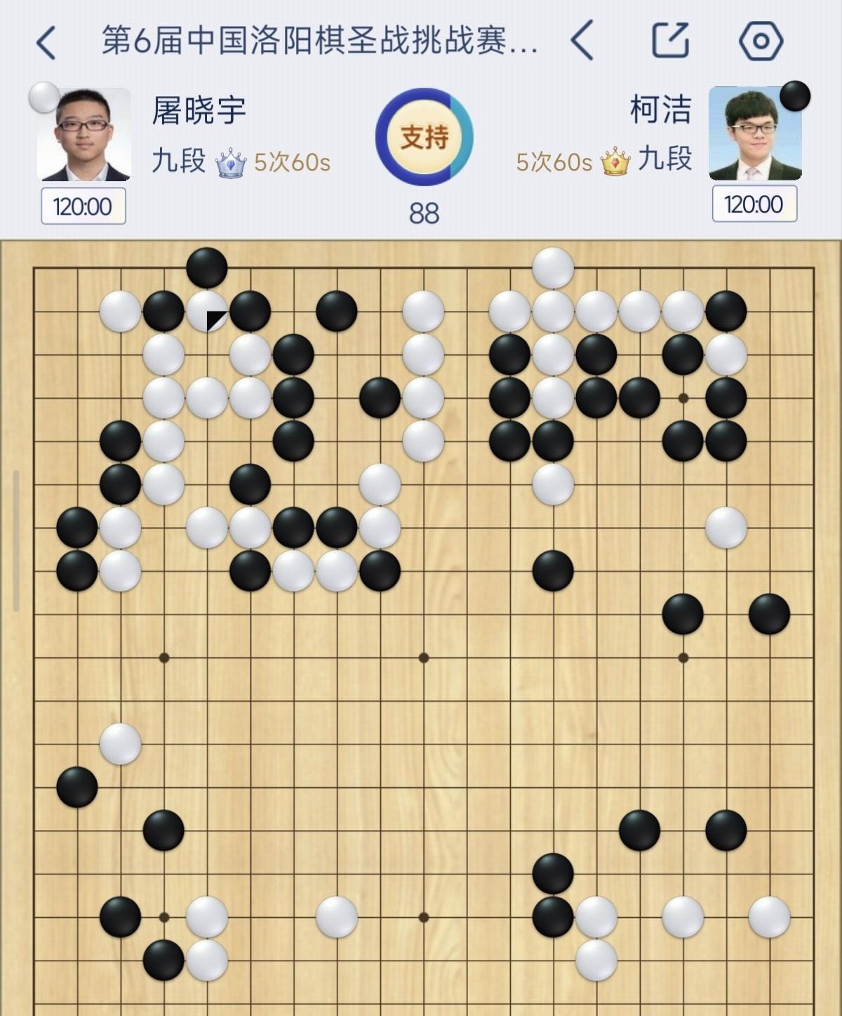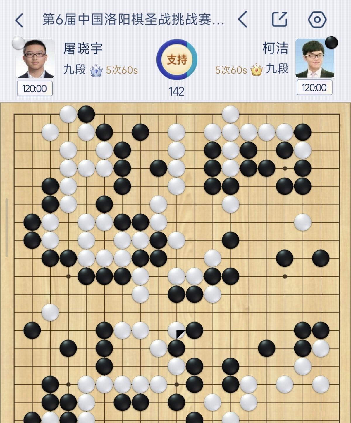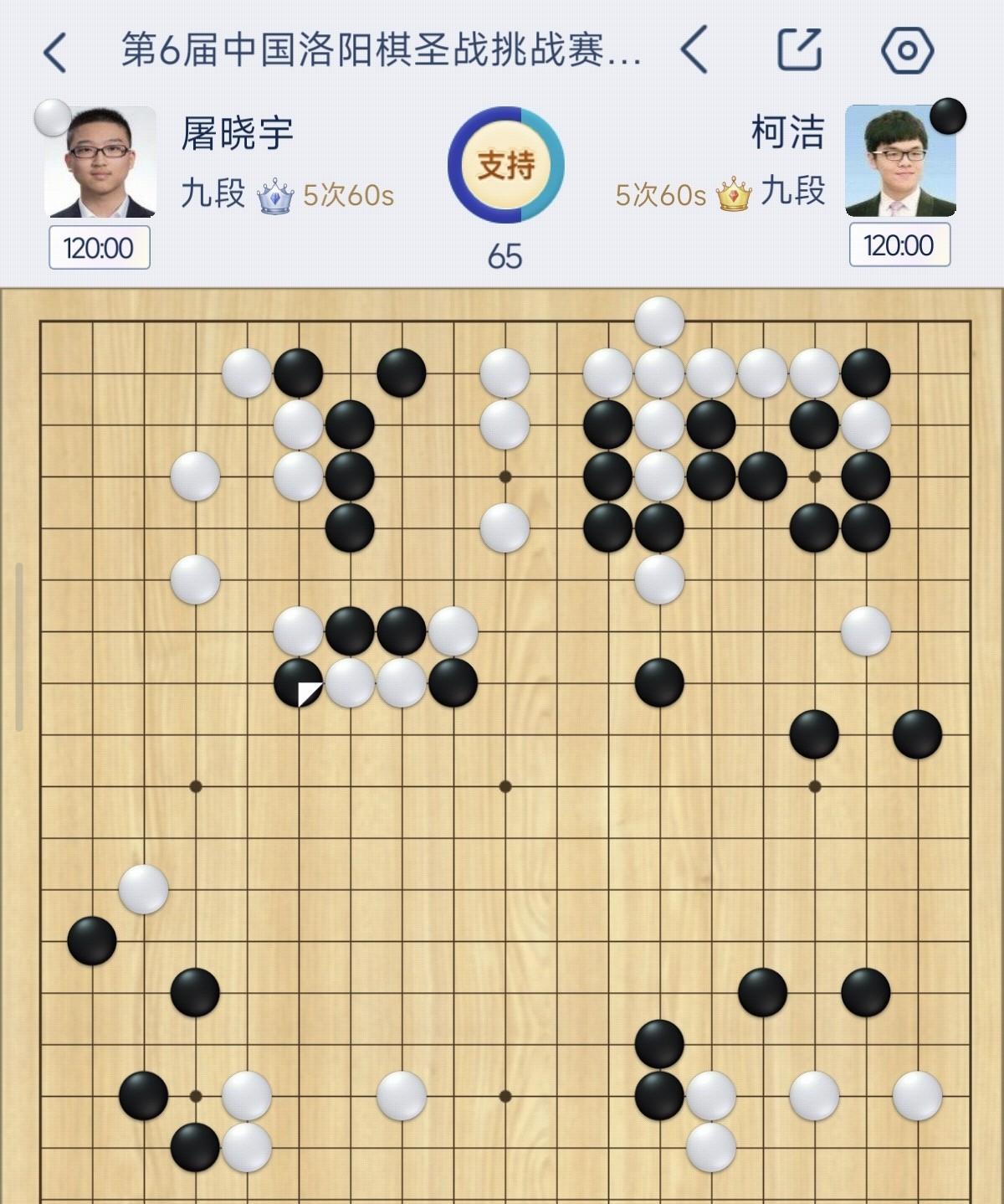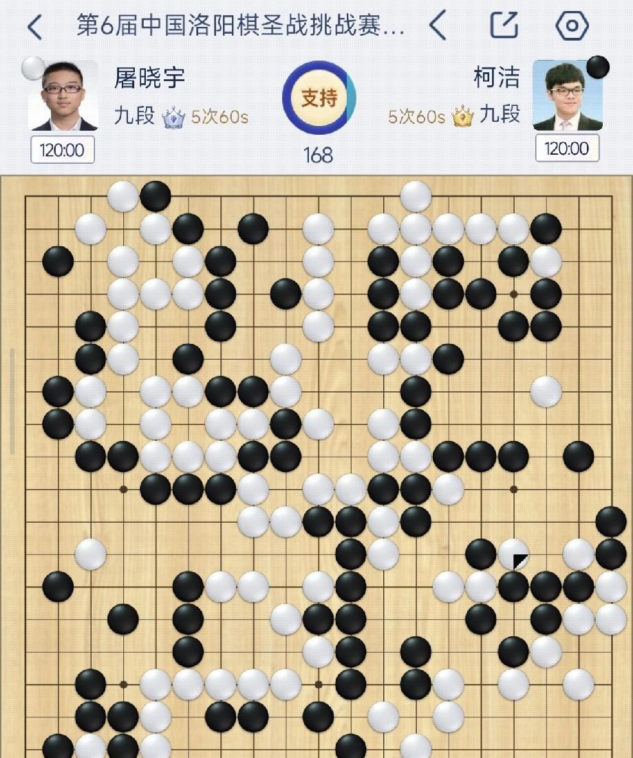 柯洁中盘告负,双方回到原点! 今天,中国围棋棋圣战总决赛第二盘比赛,战至第168手,上届棋圣战冠军柯洁执黑中盘不敌屠晓宇九段,双方大比分战成1:1。 明天,双方将展开决胜盘的争夺。是柯洁达成棋圣三连冠的壮举,还是新棋圣加冕,让我们拭目以待。
