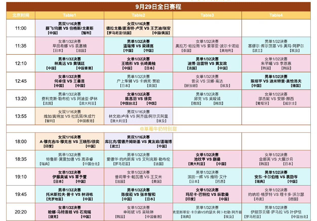 抢先看[笑哭]! 后天(9月29日,周一)赛程来喽! WTT中国大满贯9月29日