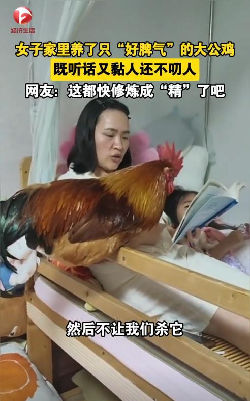 “成精了!”上海,过年时,老家的人给女子送来只大公鸡,原本是准备杀了吃的,但是孩子非常喜欢它,说什么也不让杀,女子就将鸡养在家中。没想到,这只鸡不仅脾气好而且黏人,一喊名字立马飞奔过来。网友:上厕所怎么办? 鸡属于比较常见的家禽,基本上全国各地都有,而且每个地方都有特色做法,但是却很少听说把鸡当宠物养的。 没办法,李女士只能先将鸡养在家中,原本打算过几天再吃的,结果养了几天她发现这只鸡特别黏人,而且很听话,李女士也有点舍不得了,就一直养在家里。 为了不让公鸡随地拉屎,一家人还想了个独特的办法,将塑料袋改装成了“屎兜子”!先撕个洞从尾巴穿进去,然后将袋子套在鸡翅膀上,这样鸡屎就全拉在塑料袋里了。 李女士表示,这只公鸡的脾气非常好,而且一喊名字就过来,平时也不会叨人,特别喜欢跟在孩子身边玩耍。 唯一的缺点就是早上没有办法睡懒觉,即使休息日在家,公鸡还是到点就开始打鸣。 网友看后表示,估计这鸡十分清楚自己的地位,要是敢叨人,自己早就被用葱、椒、蒜给处理了。 信息来源:《女子家里养了只“好脾气”的大公鸡,既听话又黏人还不叨人,网友:这都快修炼成“精”了吧。》AHTV第一时间
