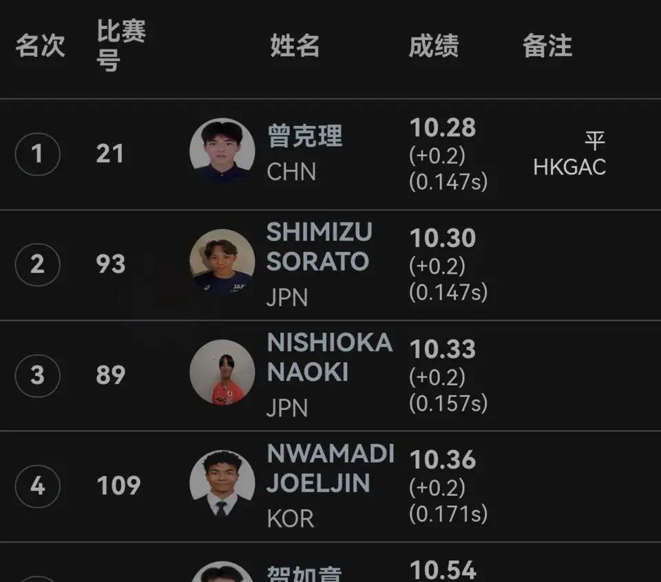 昨晚在香港进行的第二届东亚U20田径锦标赛男子100米决赛中,中国队19岁的曾克理跑出10秒28,击败两位日本选手获得冠军,这一成绩平了中国香港本地赛事的男子百米纪录,今年跑出10秒整的世界少年最好成绩、预赛又飙出10秒14的日本高中生清水空跳以10秒30获得亚军,另一位中国选手贺如意以10秒54获得第五。
