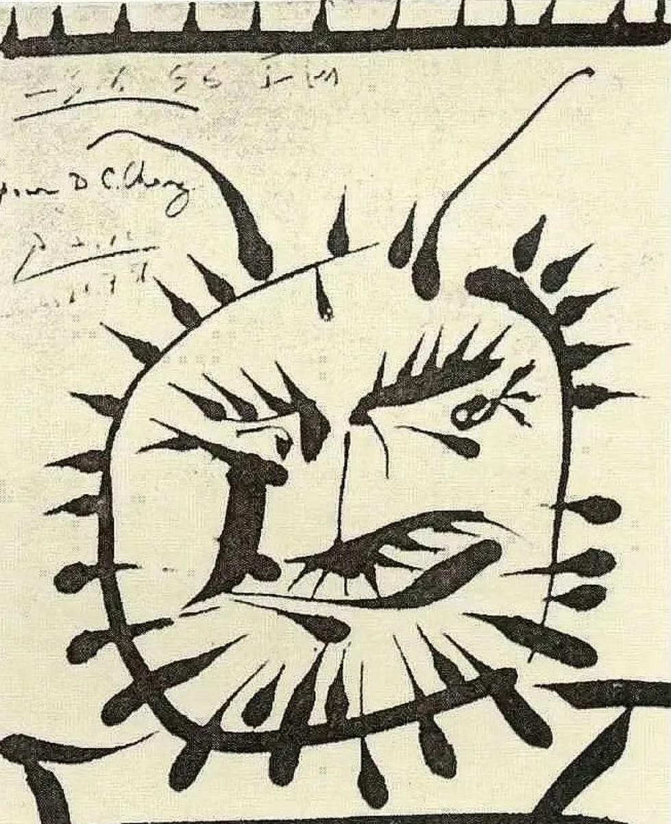 1956年张大千到毕加索工作室拜访,毕加索用毛笔画了右边这幅画送予张大千。