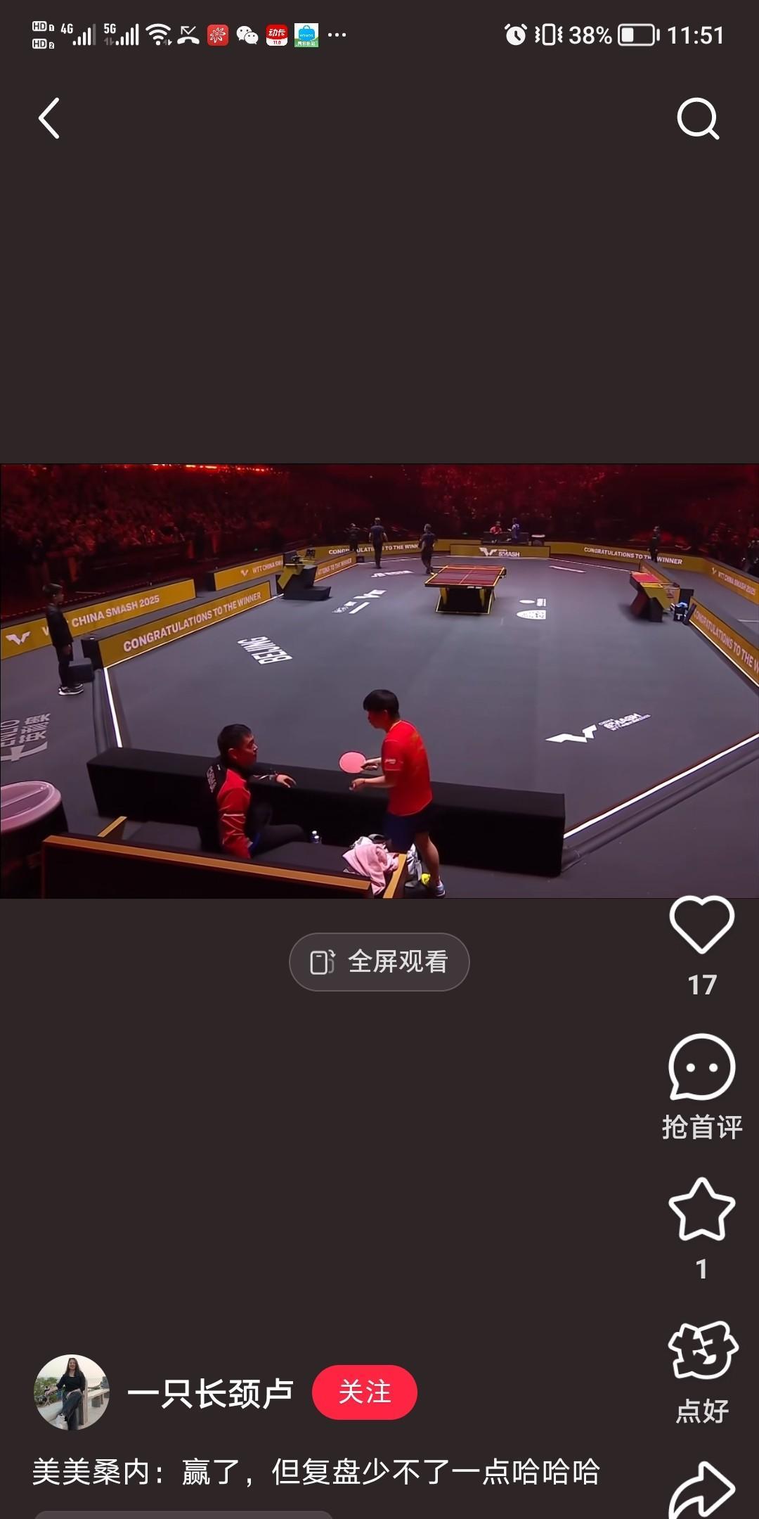 小杨也在观众席看莎莎的比赛。 今天的第一场比赛是是莎莎对阵平野美宇,看到现场的球迷都坐满了,大家都在等着莎莎出来。这次比赛莎莎的场外是邱贻可教练,马琳应该是没来,邱导还是更了解莎莎,俩人局间一直都在交流。 莎莎穿比赛服也是有讲究的,今天第一场比赛莎莎穿了红色上衣和蓝色短裤,莎莎和桥本的那场比赛,她就穿着这条短裤,后来莎莎偶尔就会拿出来穿着比赛,要把日乒都拦住。今天莎莎是3-1战胜平野美宇,好几个镜头看到平野美宇都被打的笑了,虽然平野输了,但是看她和莎莎打比赛也很开心,是真的在享受比赛。平野确实涨球了,但是莎莎更稳。 莎莎的球迷们都很爱她,莎莎小手一指,现场瞬间就安静了。赛后莎莎边收拾边和邱导复盘,采访时莎莎说这是自己第二次在这里比赛,感谢有这么多的球迷来支持她,她真的知道球迷们都很爱她,每次都会感谢球迷。