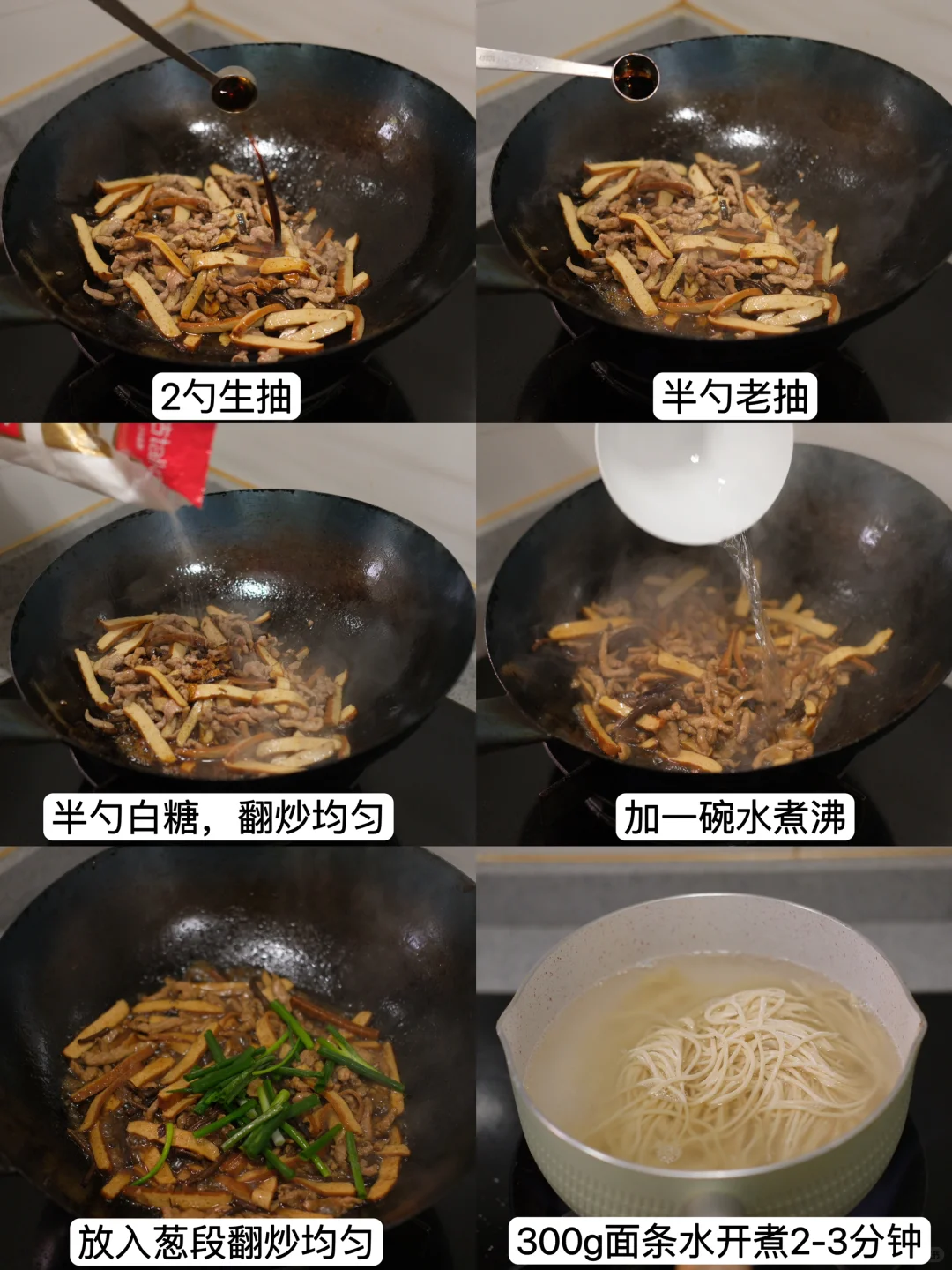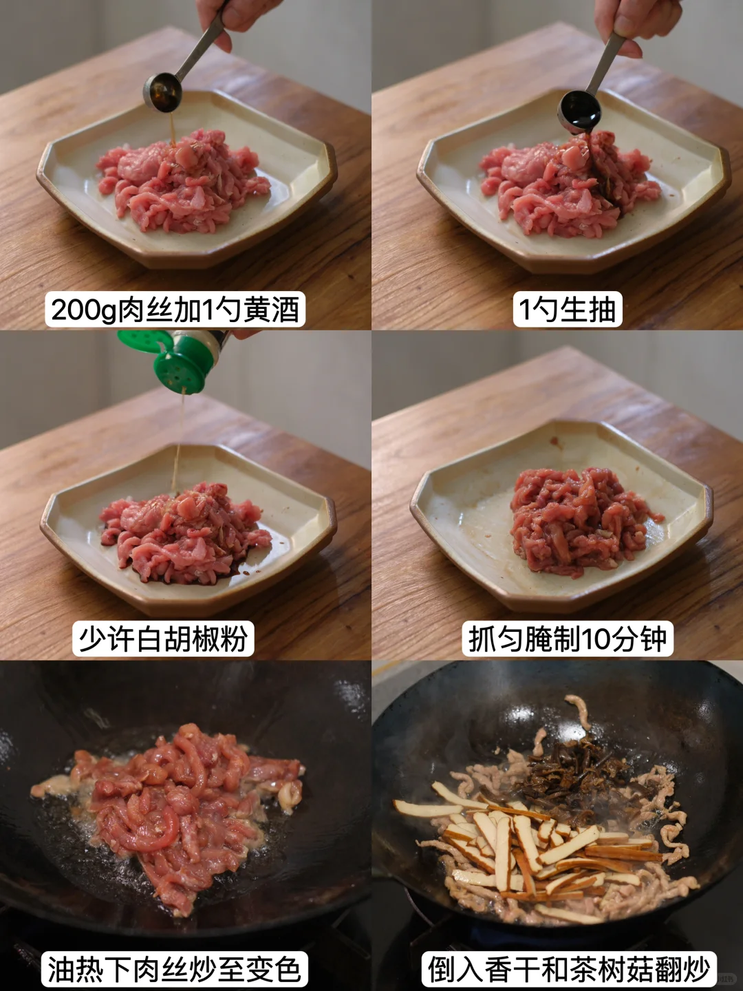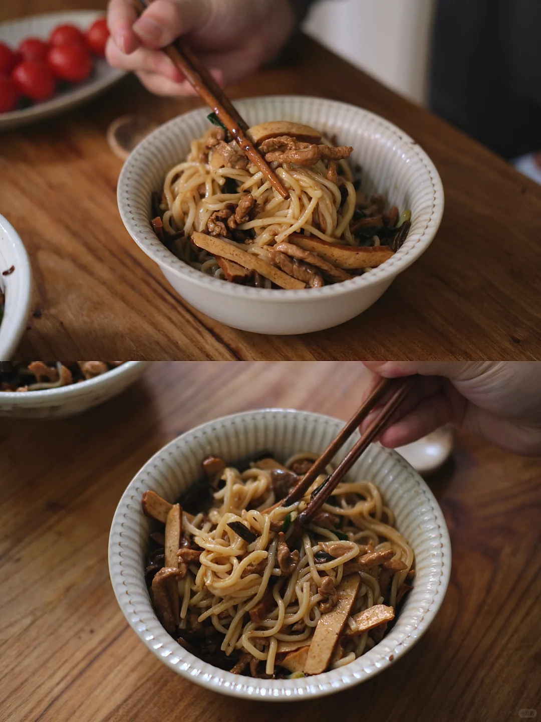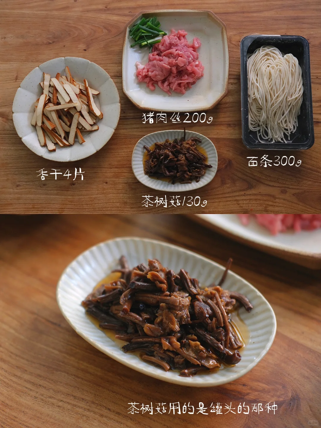 一碗朴实无华的面,便是家的味道。 分享一个我们经常吃的“茶树菇香干肉丝拌面” 拌面里最普通的做法 拌上醋和辣椒更好吃~ 两人份的食材准备: 130g茶树菇(茶树菇罐头,即食的那种)、200g猪肉丝、300g面条、4片正方形的那种五香干