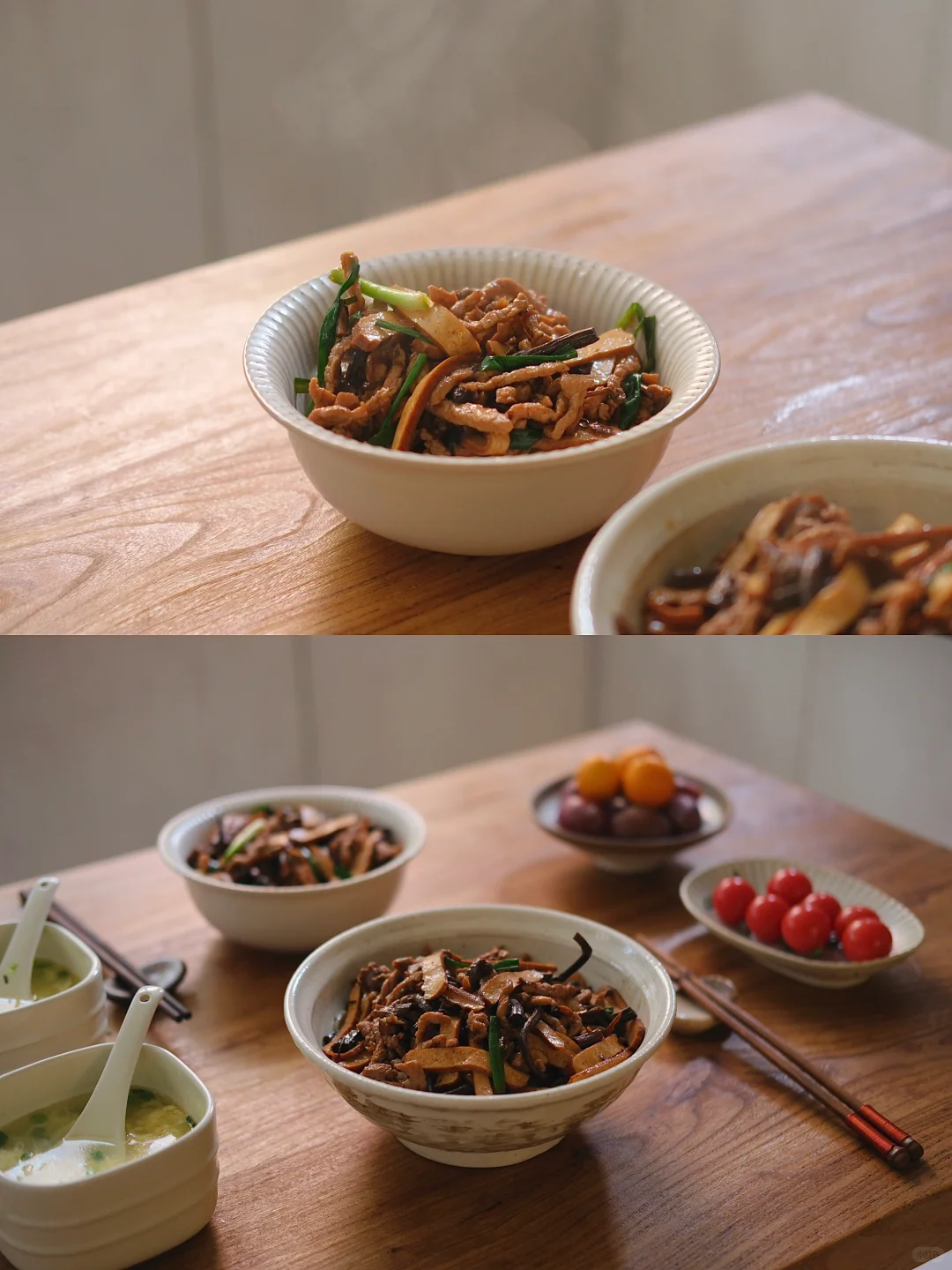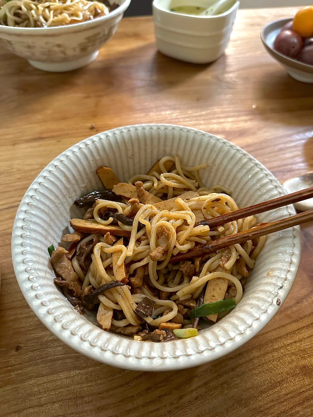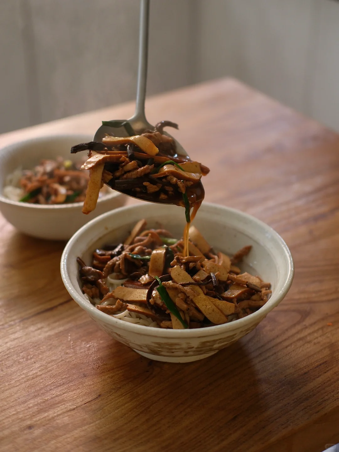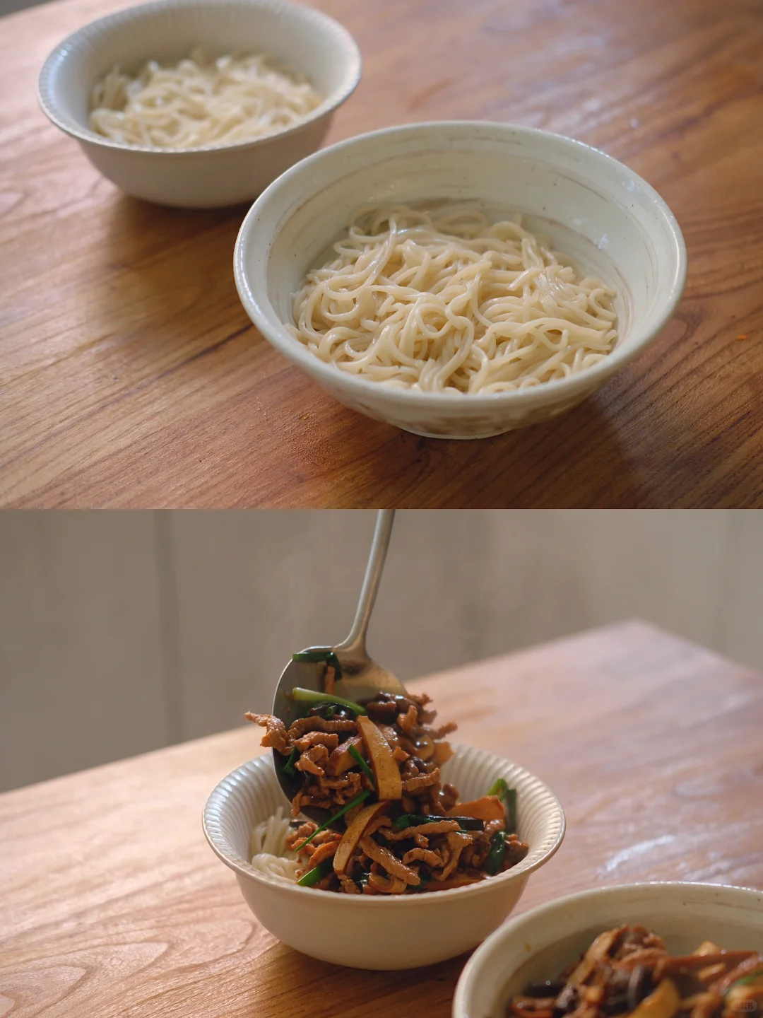 一碗朴实无华的面,便是家的味道。 分享一个我们经常吃的“茶树菇香干肉丝拌面” 拌面里最普通的做法 拌上醋和辣椒更好吃~ 两人份的食材准备: 130g茶树菇(茶树菇罐头,即食的那种)、200g猪肉丝、300g面条、4片正方形的那种五香干