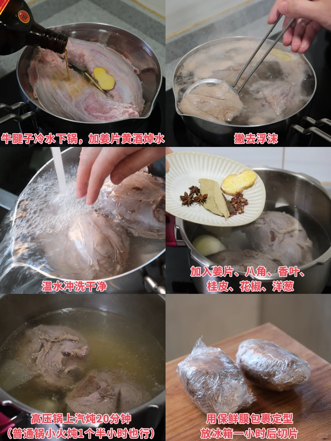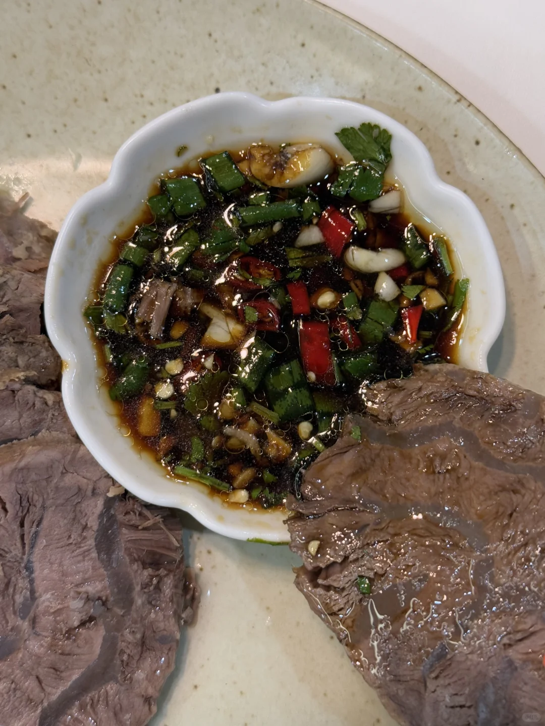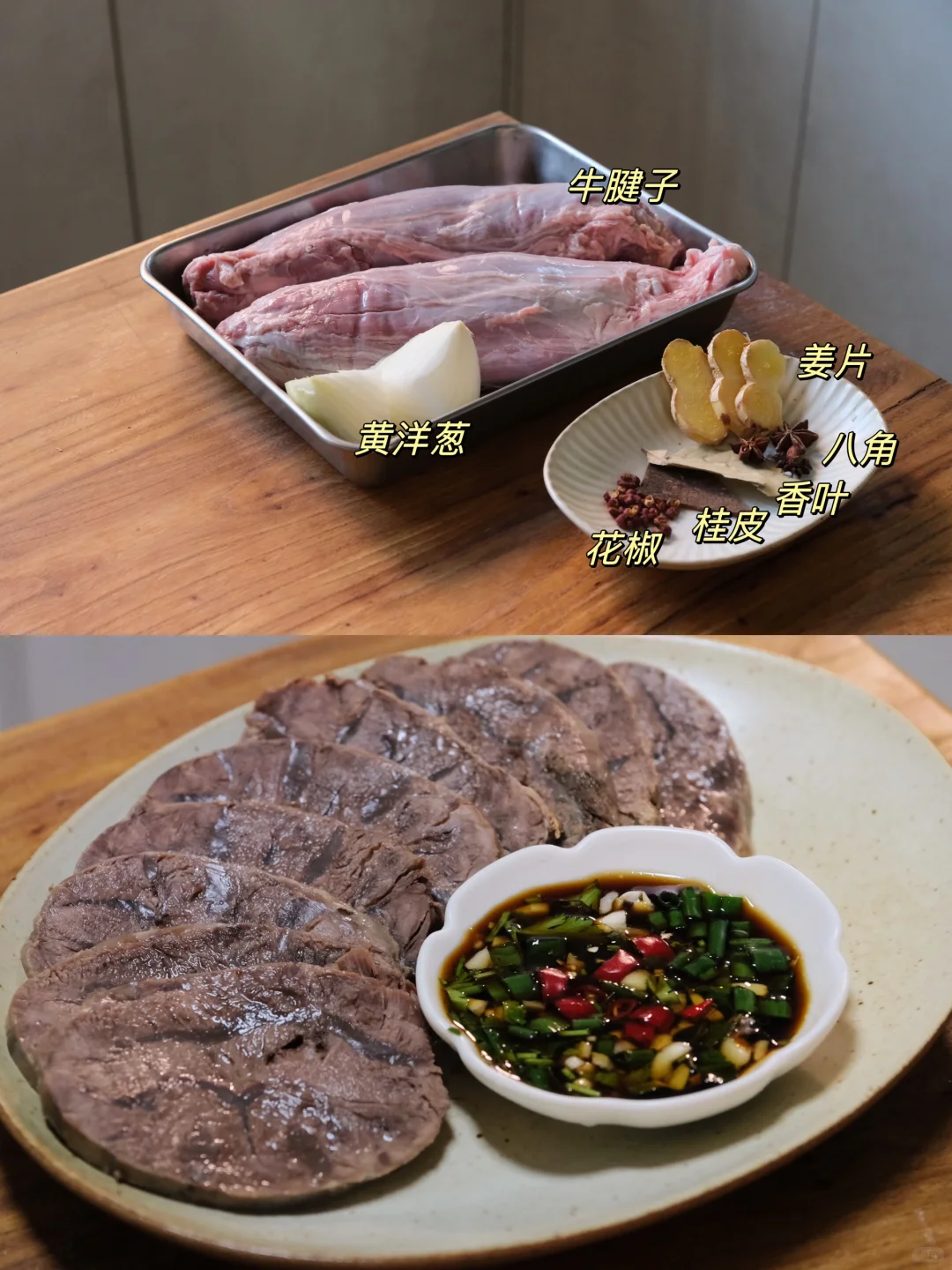今日菜单: 清炖牛腱子 牛腱子的原汤也不浪费,用来煮面太香了! 蘸料:生抽和醋各1勺、香油、葱、蒜末、小米辣、香菜、少许白糖。 做法很简单,牛腱子泡洗干净,冷水下锅,加姜片黄酒焯水,温水洗净。加姜片、八角、香叶、桂皮、花椒、洋葱,高压锅上汽炖20分钟,筷子可以轻松插入就行了,保鲜膜包起来定型,放冰箱冷藏一小时,拿出切片即可。