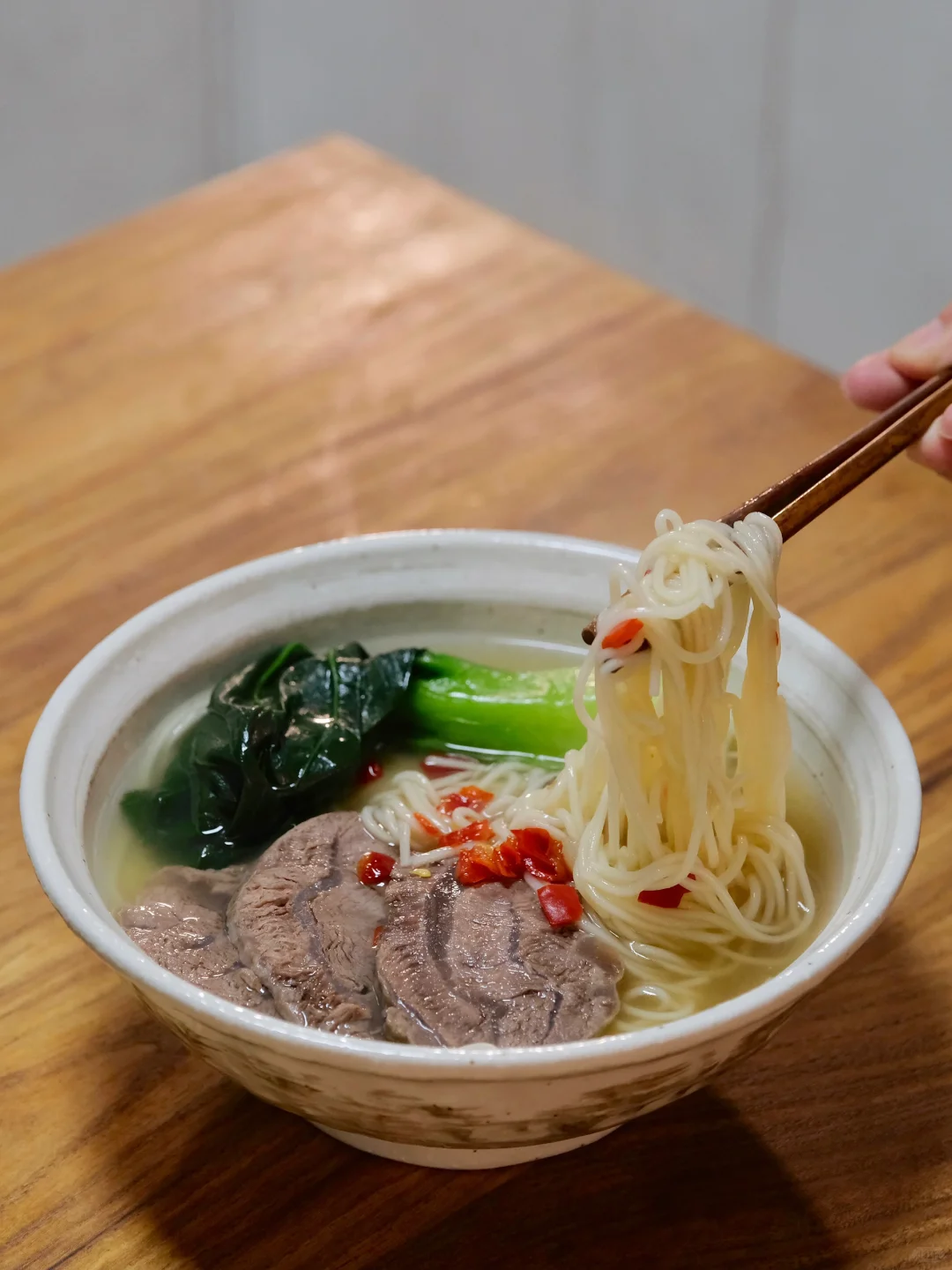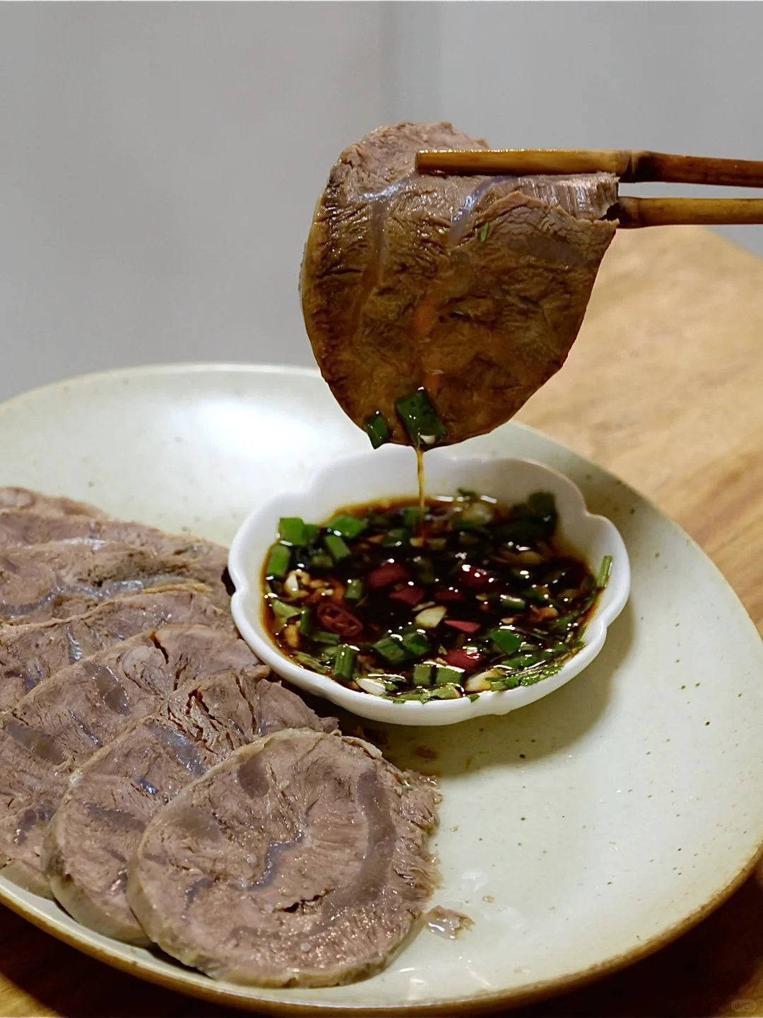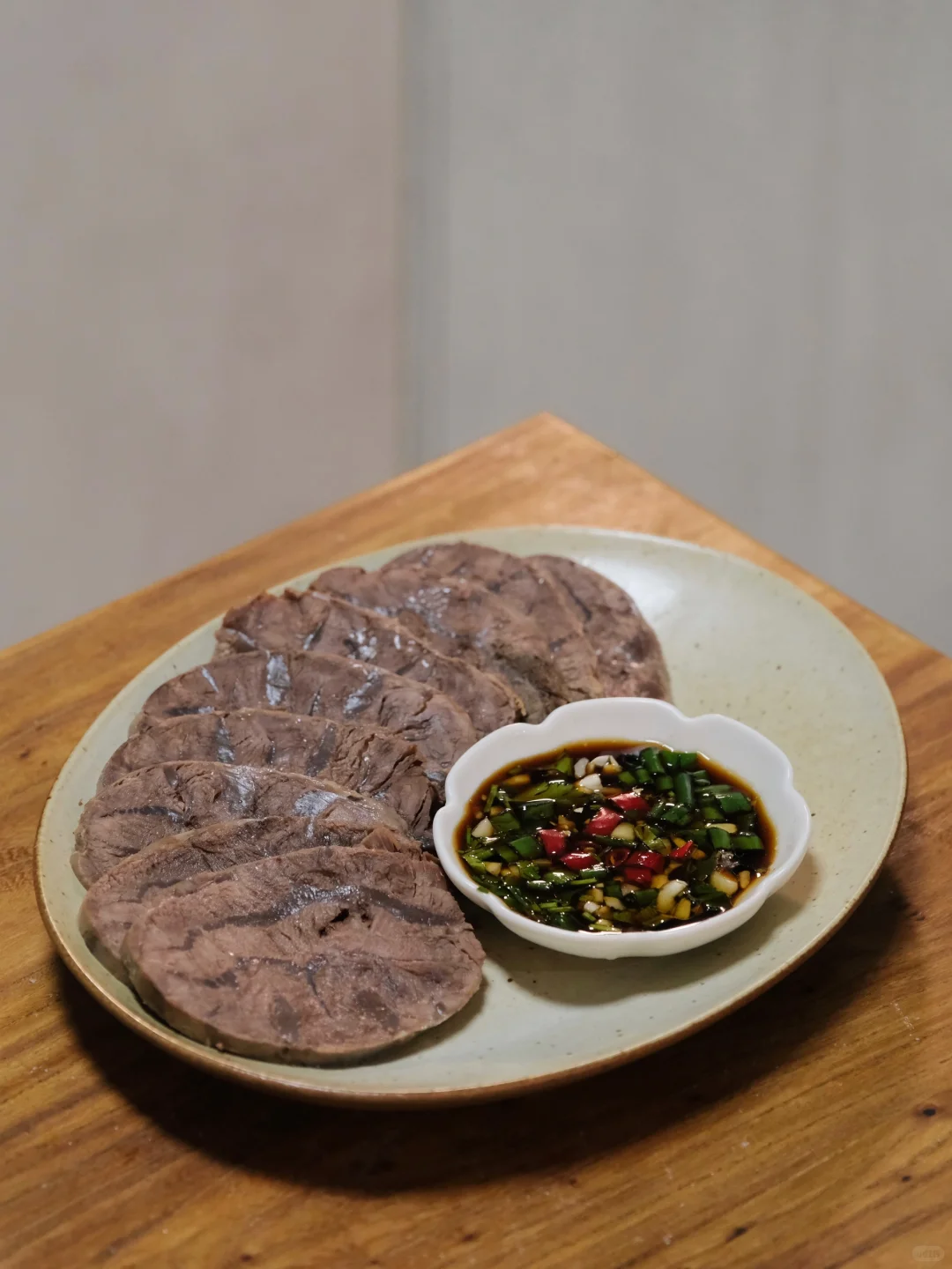 今日菜单: 清炖牛腱子 牛腱子的原汤也不浪费,用来煮面太香了! 蘸料:生抽和醋各1勺、香油、葱、蒜末、小米辣、香菜、少许白糖。 做法很简单,牛腱子泡洗干净,冷水下锅,加姜片黄酒焯水,温水洗净。加姜片、八角、香叶、桂皮、花椒、洋葱,高压锅上汽炖20分钟,筷子可以轻松插入就行了,保鲜膜包起来定型,放冰箱冷藏一小时,拿出切片即可。