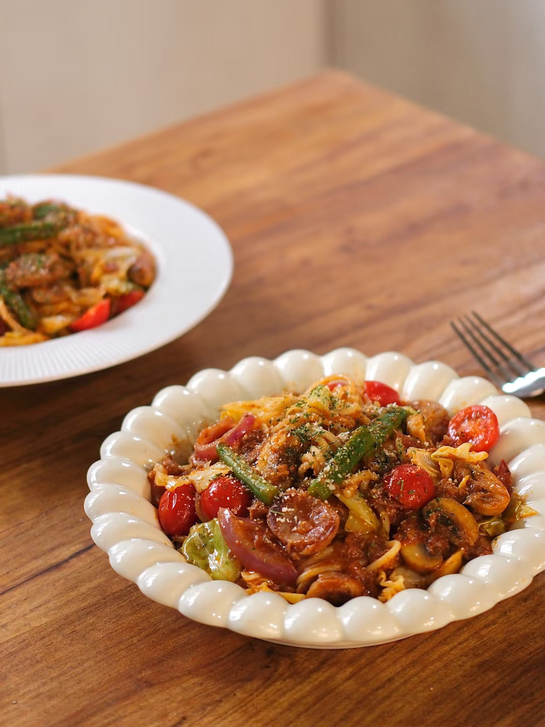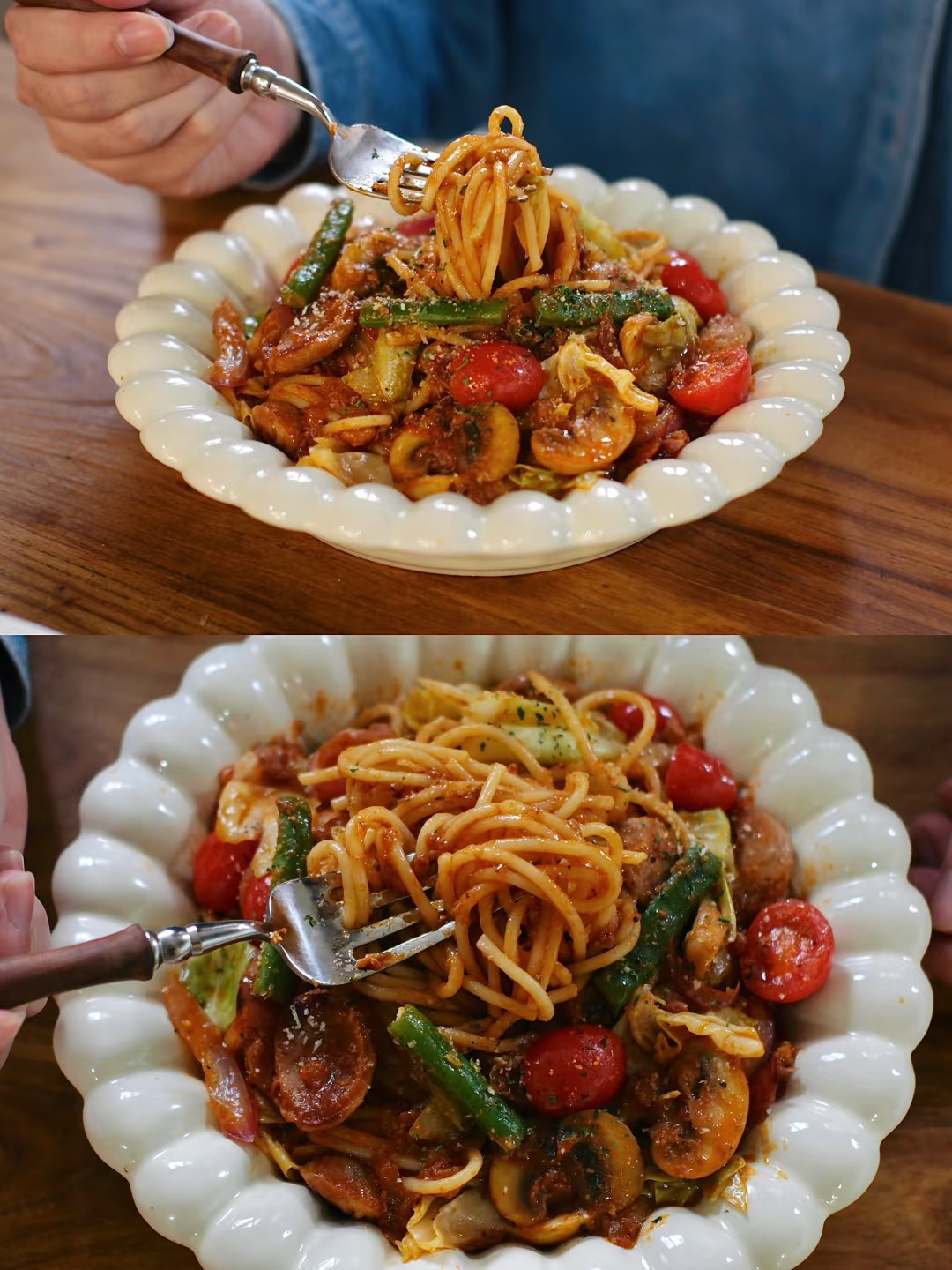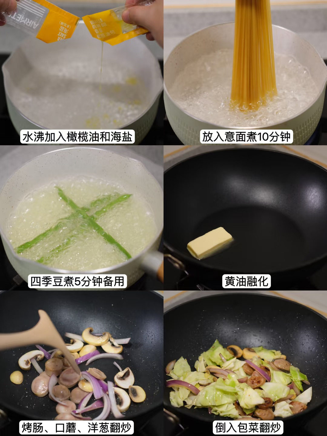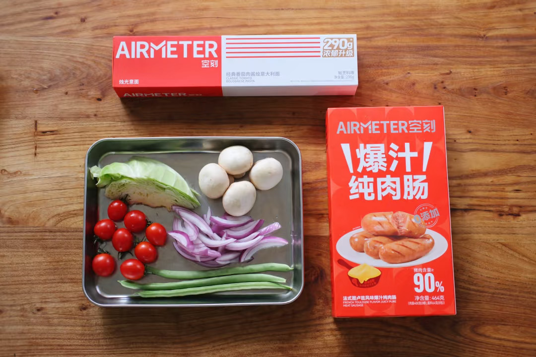 食材:意面、烤肠、包菜、四季豆、洋葱、口蘑、小番茄