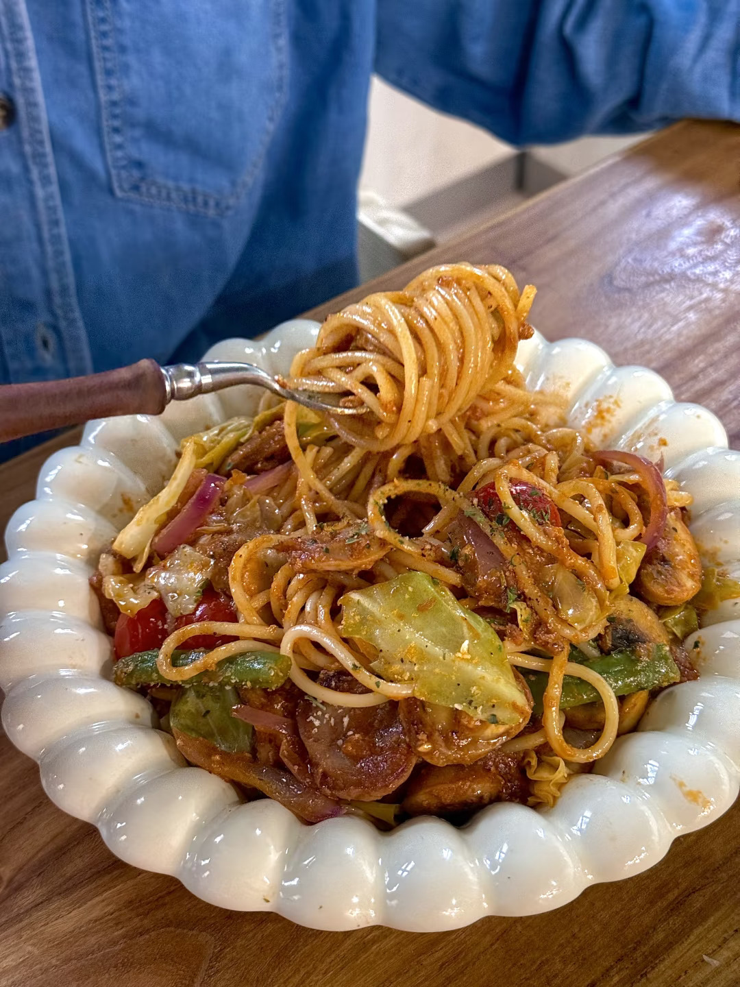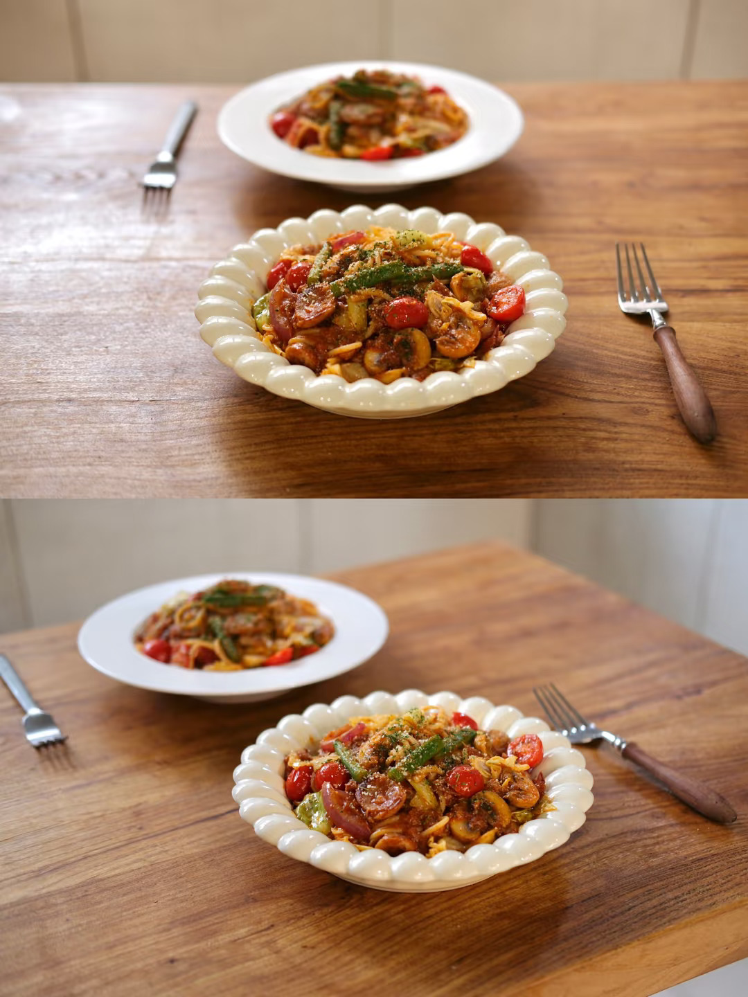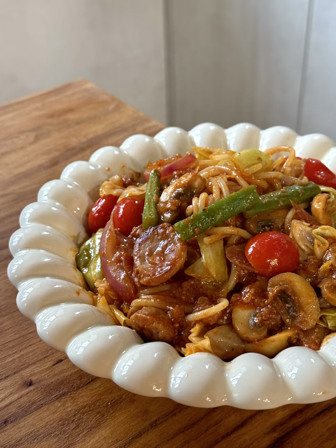 食材:意面、烤肠、包菜、四季豆、洋葱、口蘑、小番茄