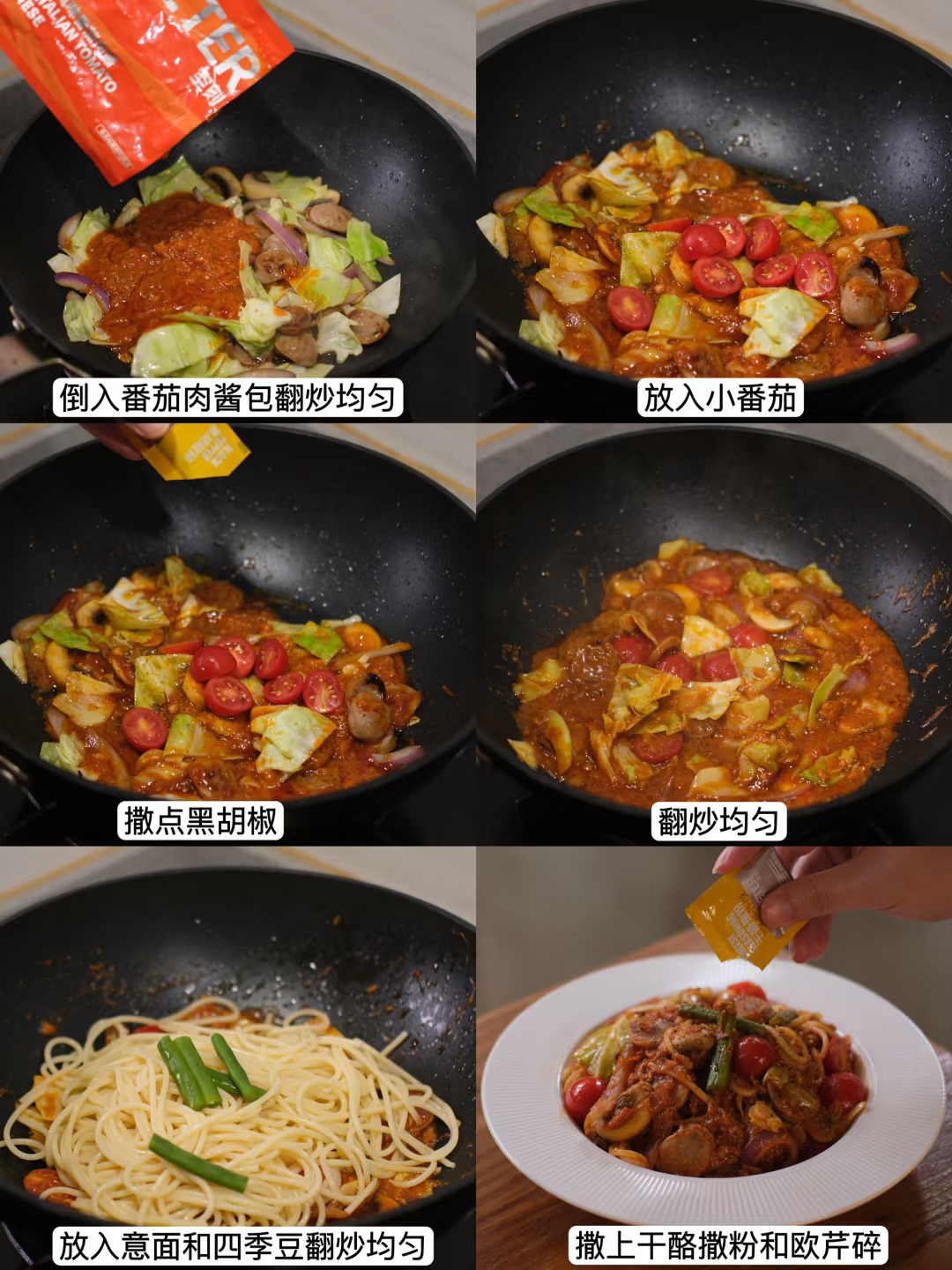 4.倒入包菜翻炒,倒入番茄肉酱包翻炒均匀,加入小番茄,加入少许黑胡椒粉,放入意面和四季豆翻炒均匀即可。