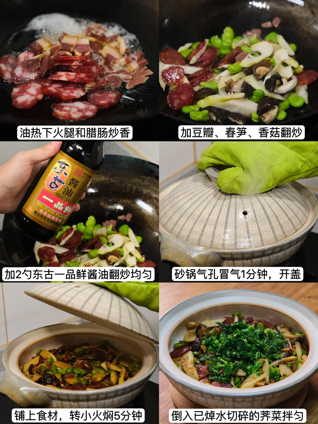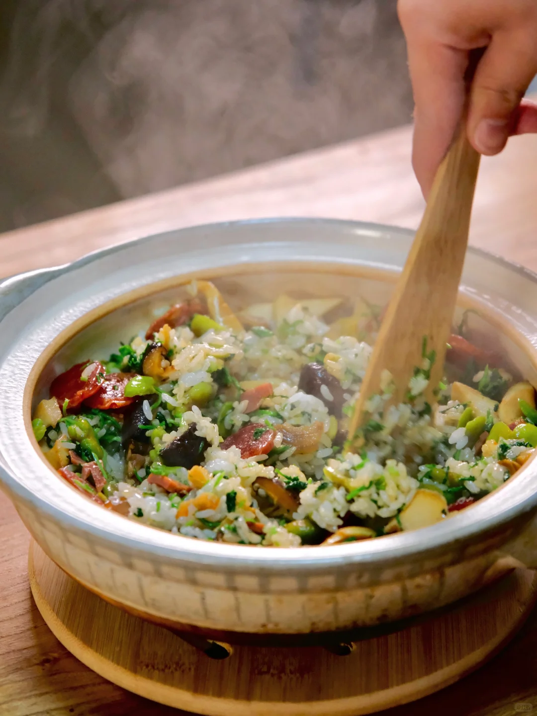 最春天的,还得是那锅砂锅饭,春笋脆嫩,豆瓣煮得绵软,荠菜混着腊味的油脂香。挖一勺冒着热气的米饭,酱油的醇香裹着时令鲜味在口中化开,连最后一粒米都舍不得剩下。