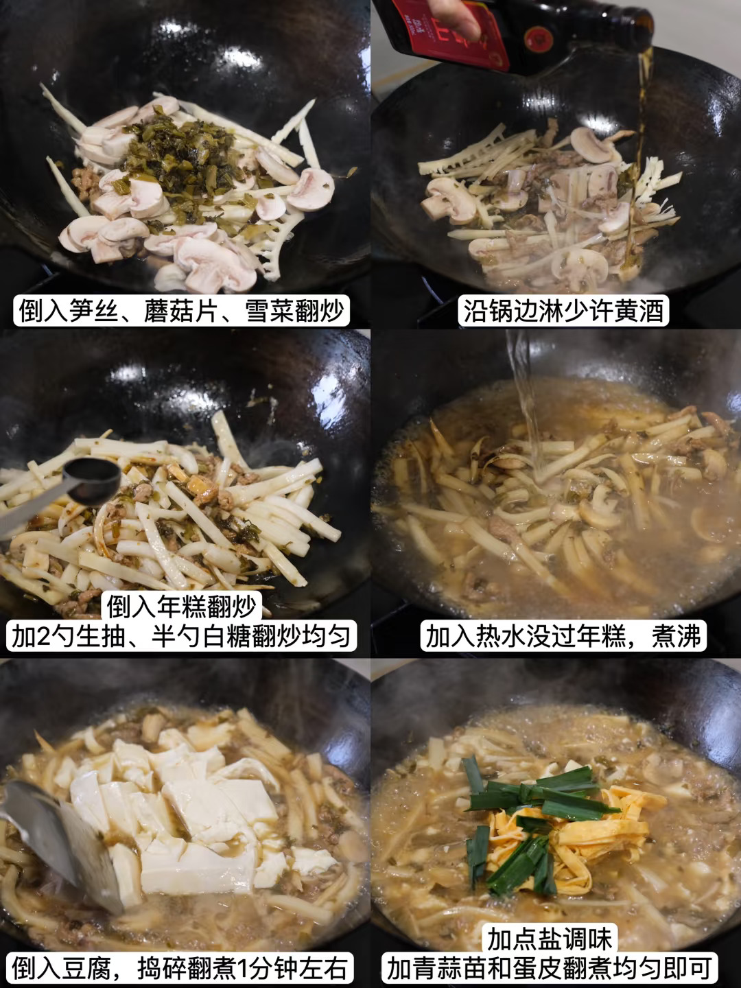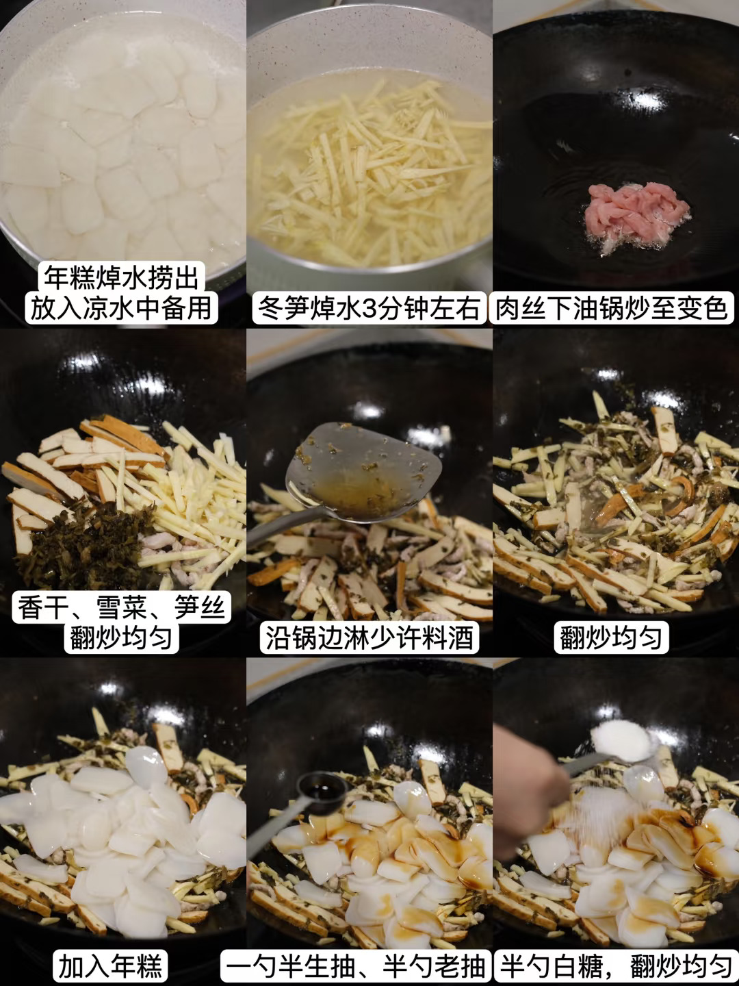 1⃣️雪菜鸡蛋香干肉丝炒年糕 2⃣️青菜肉丝汤年糕 3⃣️嵊州豆腐年糕 4⃣️雪菜笋丝汤年糕 5⃣️铁板烤年糕 6⃣️桂花白糖蒸年糕 7⃣️雪菜笋丝炒年糕 8⃣️白菜蘑菇肉丝年糕