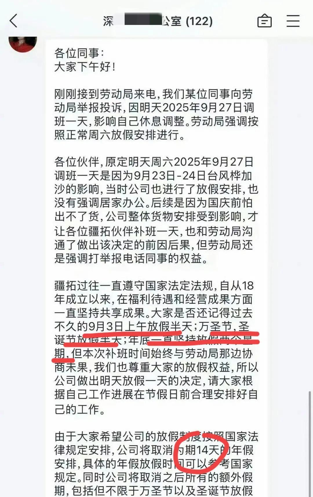 补班被举报,老板很生气,后果很严重! 这是真正的“捡了芝麻丢了西瓜”,多了一天休假,取消了额外的假期。本来因为台风放假了补回来,员工可以与公司相互理解,情有可原。举报的员工会被其他同事的眼神“杀”死,所有人的福利都没了!(万圣节、圣诞节假期也没了) 本来只是个职场小事件,没想到上了热搜,证明现在的职场矛盾还是很突出,公司和员工之间都缺乏安全感和信任感,社会就业环境问题该重视了!