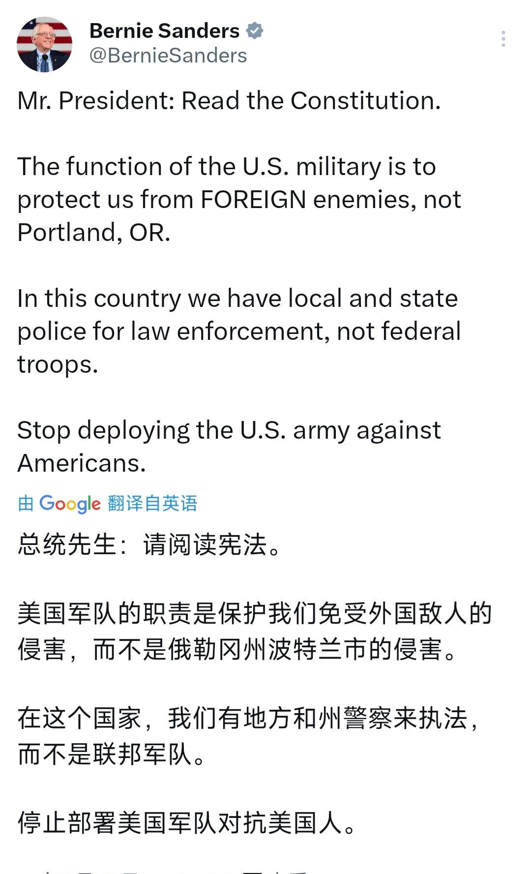 美国参议员伯尼·桑德斯今天(北京时间9月28日)批评特朗普道:“总统先生:请阅读宪法。美国军队的职责是保护我们免受外国敌人的侵害,而不是针对俄勒冈州波特兰市。在这个国家,我们有地方和州警察来执法,而不是联邦军队。停止部署美国军队对抗美国人。”(图三为特朗普的发文。) [机智]评几句:桑德斯与特朗普这场隔空交锋,将美国宪政危机赤裸裸摆上台面。特朗普公然践踏宪法分权原则,将军队当私兵调往国内平息抗议,这是要把“总统”变成“军阀”?桑德斯一针见血戳破其越权本质——地方治安本属州权范畴,联邦军队插手国内事务,是宪法明文禁止的“军事独裁”苗头。更讽刺的是,特朗普口中“饱受战争蹂躏”的波特兰,不过是场抗议活动,却被他渲染成“内战战场”。