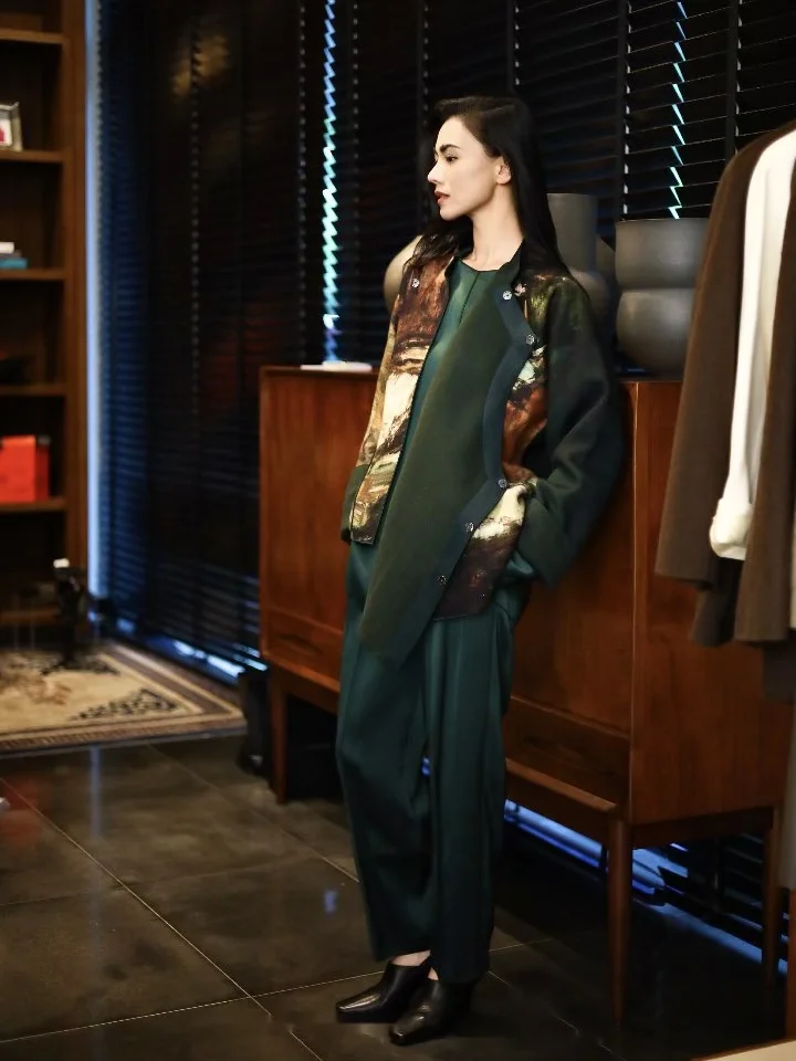 刘亦菲这次选择了一身米杏色柔纱长裙,搭配同色系印花薄纱披肩,轻盈面料自带朦胧质感