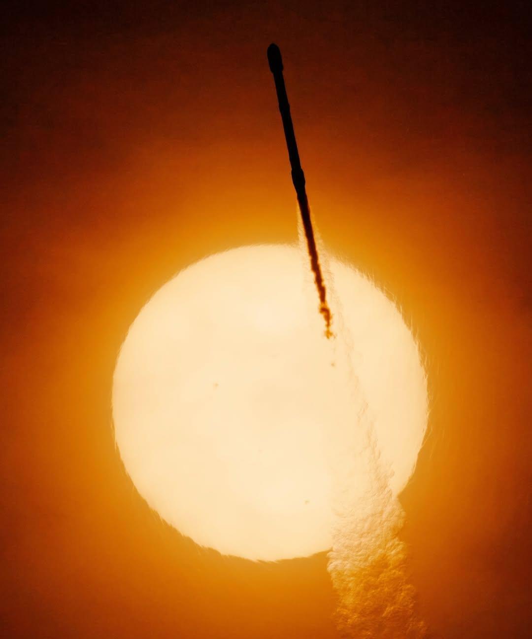 马斯克的“火箭凌日”,拍得确实漂亮! 下图1,是国外摄影师使用连接了天文相机的特殊太阳望远镜拍摄的空X火箭发射时与太阳重叠时的照片! 确实是“火箭凌日”了,图2是细节图,背景中的太阳,看着有油画的质感,图3则是使用普通相机配合长焦镜头和滤镜拍出来的,这才是普通人能拍出来的效果![捂脸]