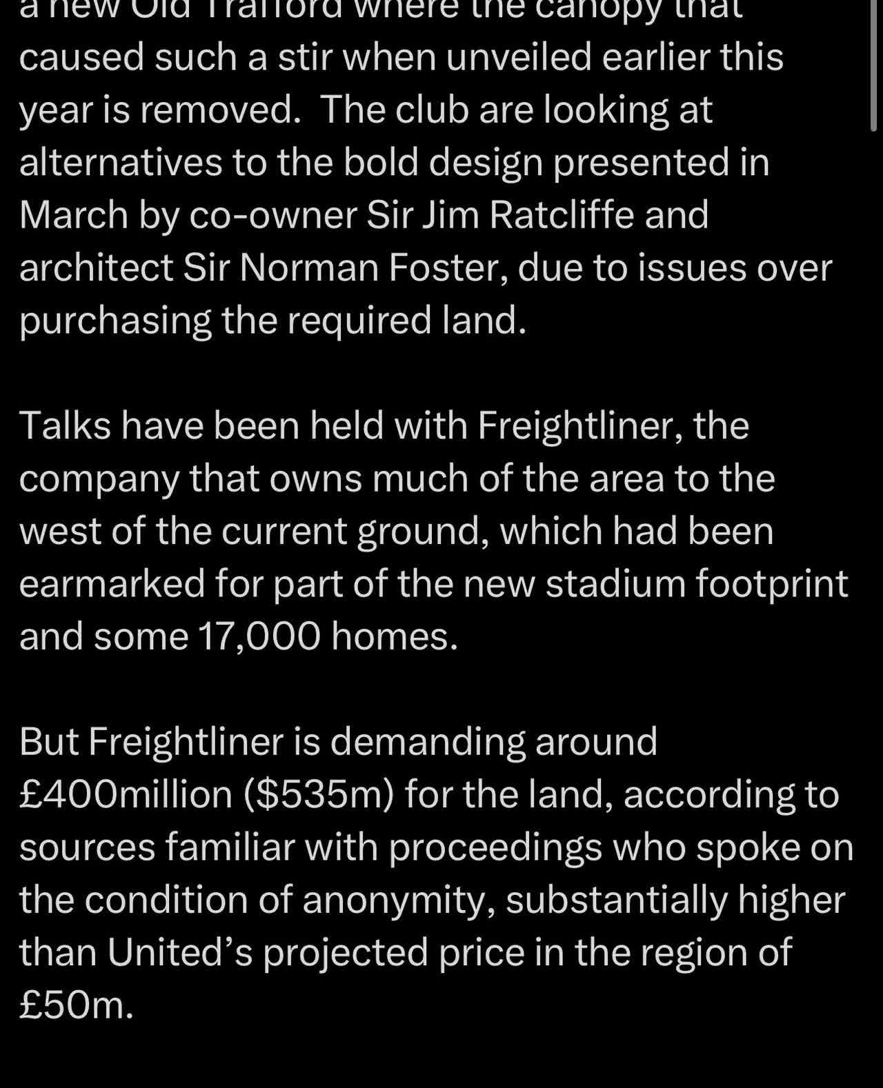 曼联付不起动迁费[捂脸] 🔵10倍的差价,真的非常非常搞笑,曼联在没有完成土地储备的前提下,就宣布新球场计划,你这不是留着机会给别人狮子大开口嘛,管理层的脑子真的是很抽象。 🔴目前,曼联已与 Freightliner 公司进行了谈判,该公司拥有现有球场西侧大部分土地,该区域已被计划用于建造新体育场的部分建筑和约 17,000 配套住宅。 🔴但据不愿透露姓名的知情人士透露,Freightliner对这块土地的要价约为 4 亿英镑(5.35 亿美元),大大高于曼联预计的 5000 万英镑左右的价格。