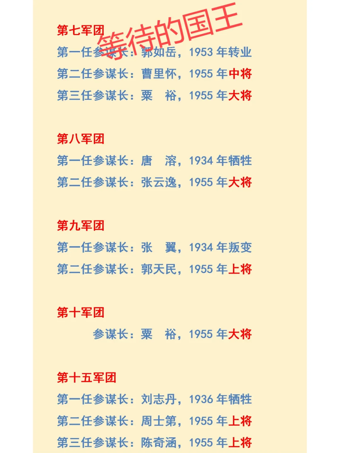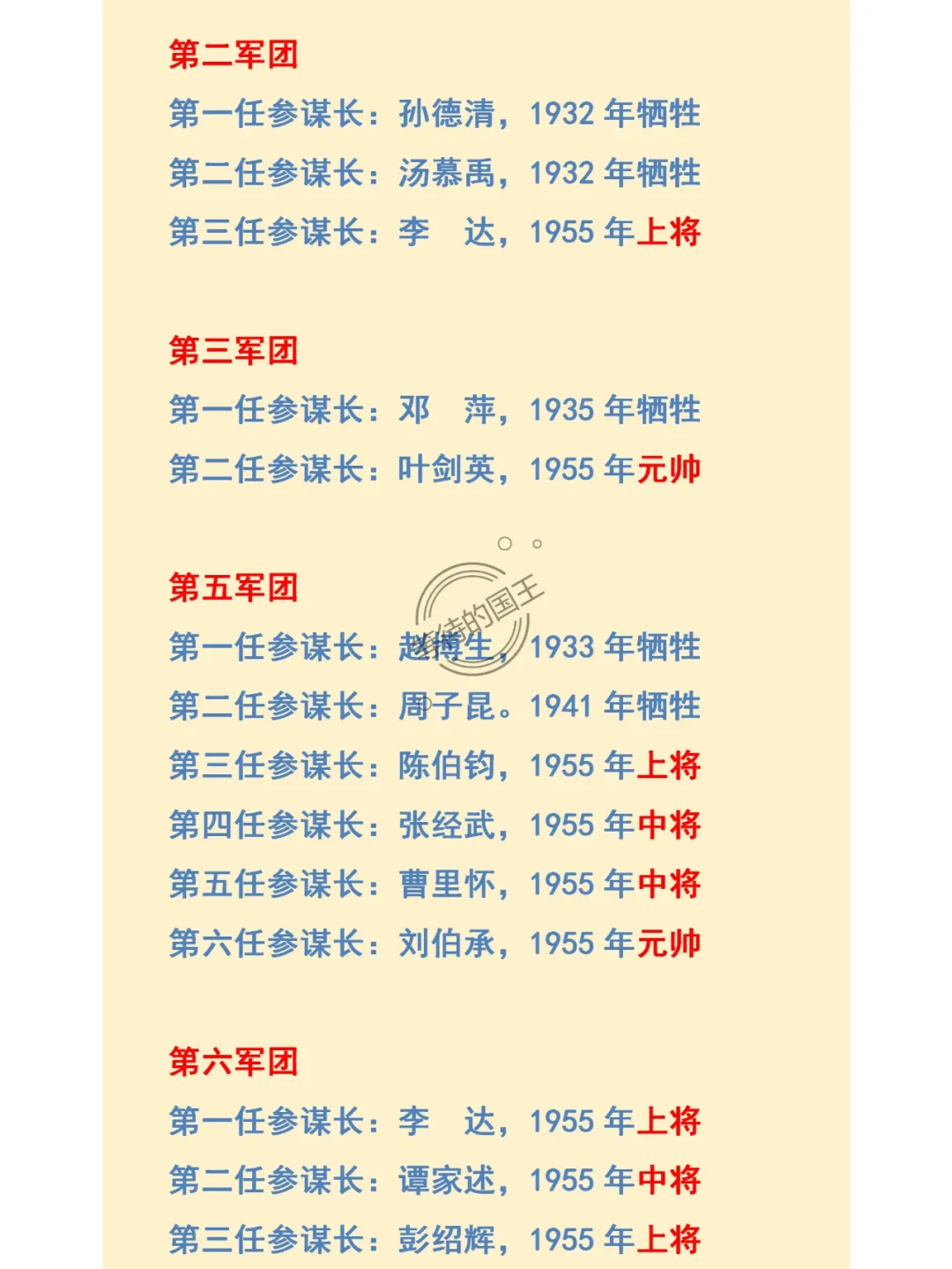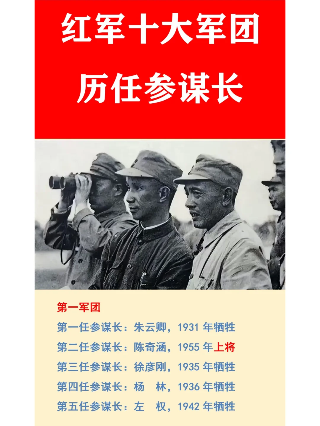 叶剑英:曾是彭德怀的参谋长。 刘伯承:曾是董振堂的参谋长。 粟 裕:曾是方志敏的参谋长。 如图所示,红军十大军团的历任参谋长一览表。历任参谋长最多的是第五军团,共6任。历任参谋长最少的是红十军团,仅1位。牺牲最大的是红一军团,历任五位参谋长,仅1人活到建国以后。牺牲最小的是红六军团,三位参谋长都参加了1955年大授衔。值得一提的就是他们最后的授衔,最低都是中将军衔,最高是元帅军衔,从这也可以看出参谋长的重要性。某种程度上可以说,当司令员发生意外,参谋长是随时可以接替指挥作战的关键人物。
