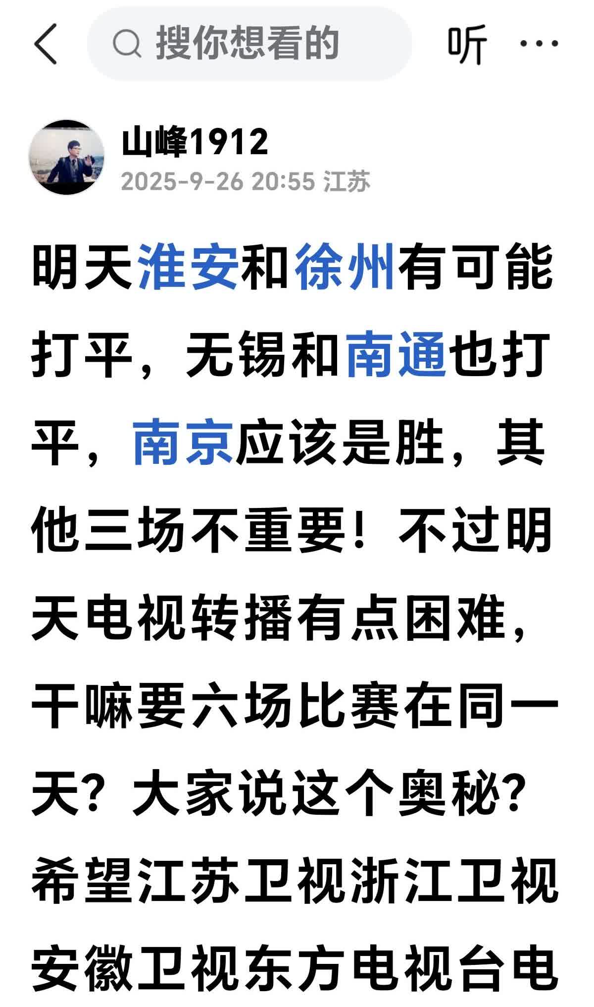 今天的比赛正好给我的预言打上了一个勾!南通队真的还适合淮安队干他一场!轰轰烈烈的再打一场!而且不可以零比零!说实话,今天的徐州队明显压制淮安足球队!但并不拼!今天最大的亮点就是淮安足球队的守门员!非常表现出色。当然,无锡队表现也非常好,南京队的胜利是昨天预料无任何悬念的。顺便表扬,苏州和常州,给大家表演非常精彩!谢谢苏州!谢谢常州!谢谢无锡队!也很精彩,第二个打平的南通队。