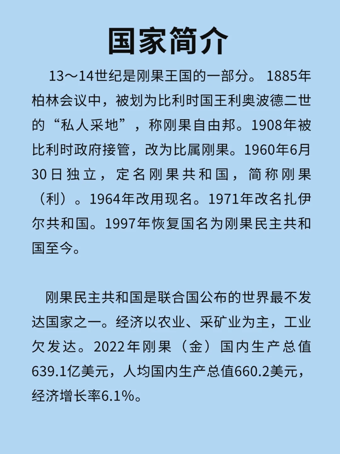 [打卡R]刚果民主共和国,简称刚果(金),位于非洲中部,国土面积2344885平方公里,人口1.032亿人(2024年)。 13-14世纪属于刚果王国的一部分,1908年被比利时政府接管,改为比属刚果,1997年恢复国名为刚果民主共和国至今。 刚果民主共和国是联合国公布的世界最不发达国家之一,经济以农业、采矿业为主,工业欠发达。