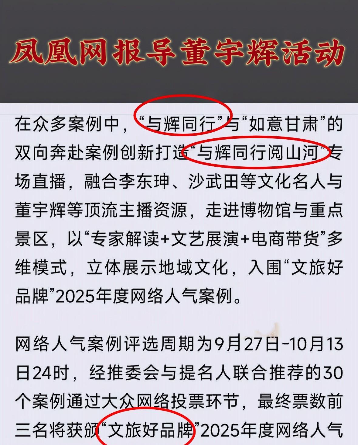 董宇辉能否入围"文旅好品牌2025",就看网络人气如何了? "与辉同行阅山河甘