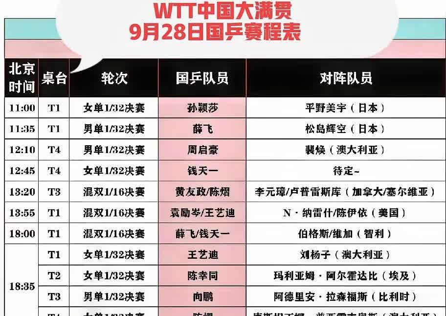 9.28日正赛开打,孙颖莎和王楚钦的比赛时间安排的很巧妙。 两人一早一晚出场, 显然是为了保住上座率的! 这次最可惜的是薛飞, 又一次替补, 可惜没碰到张本智和, 碰到了松岛辉空, 他打法似乎不克松岛。 除了薛飞和钱天一不明确, 别人应该都会顺利晋级!