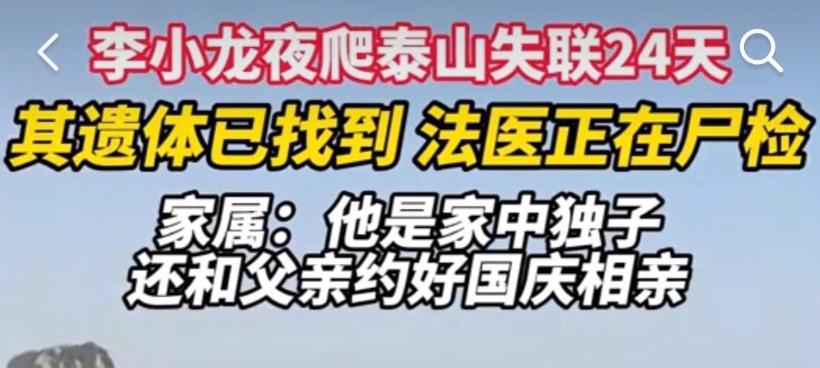 夜爬泰山的28岁男子李小龙是湖北人,他是一名技术工,爬泰山前他还和朋友开通了位置共享,没想到,他去的第二天就因手机没电,再也联系不上了…… 李小龙是家中独子,他出生于1997年,28岁的他还没有找到合适的女朋友,还是孑然一身,因此,父母一直在为他的婚事操劳。前段时间,李小龙答应父亲自己会在国庆假期时回家相亲。 殊不知,他再也没法实现这个诺言了。 9月1日他独自前往山东泰安,此番,他要去的地方就是泰山。在此之前,他从来没有去过,但他却选择了一个人夜爬。 9月1日晚上,他还与其他游客同行出现在监控探头里面,彼时,他身上背着一个大双肩包,整个人看起来一切如常。然而,到了凌晨他却突然失联了。自此,他的定位信息一直停留在了泰山,再也没有更新了。 朋友发现无法联系上他时,赶忙把这个信息转告了他的家人。 接下来的多天里,李小龙彻底失联了。为了找到他,数名救援队员可谓是用尽了全力,有人甚至在身上挂上绳索爬到了悬崖峭壁下去搜寻,只可惜还是一无所获。 9月27日,李小龙终于被找到,遗憾的是他早已经没有了生命的气息。他的遗体躺在一块大石头边上,那个位置就在声声亭附近。 当地的朋友们反馈:他被发现的地方并不在景区的大路线范围内,而是很少人才会走的野路。根据那处位置分析,他应该是在下山的时候走了小道。 明明他答应爸妈国庆假期就要回家的,而他却再也回不去了! 现如今,悲剧已无法挽回,令人心疼的是他的爸爸妈妈,他们操劳半生就这么一个宝贝儿子啊![可怜]寻找他的这二十多天里,他们吃不下睡不着,人已经瘦的脱相了…… 通过这个悲剧,希望大家在出门游玩的时候要多加小心:爬山务必走人多的路线,最好结伴同行!生命无比珍贵,请不要将自己置身于危险之中![祈祷][祈祷][祈祷][祈祷]