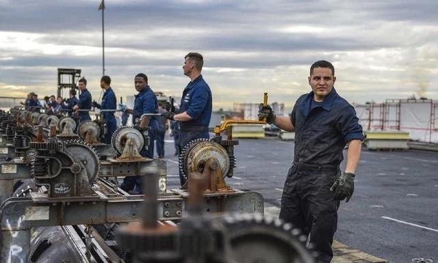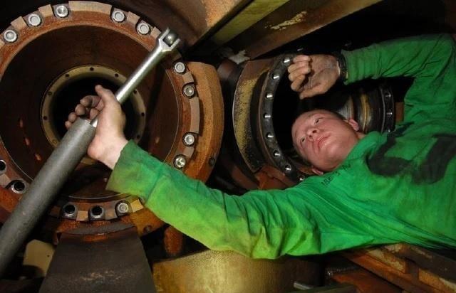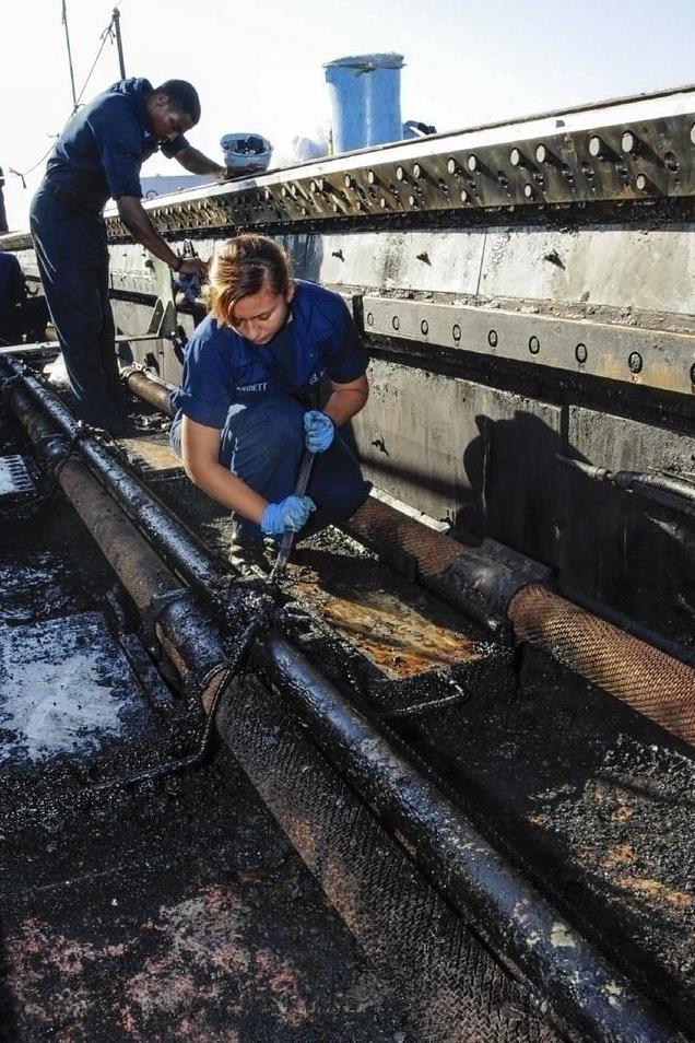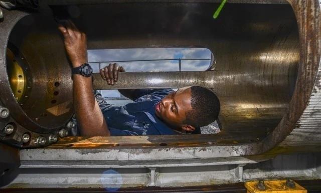这就是美国蒸汽弹射的魅力所在,电磁弹射是比不了的! 看这油污,给人一种润滑油、铁锈以及蒸汽混合的美,什么叫做美式蒸汽朋克啊,这个就是,复古工业风即视感! 言归正传,其实蒸汽弹射维护和清洗非常麻烦,耗时耗力耗人工,某些部件,比如弹射器套筒,是需要人工爬进去清洗的,真不是一般人能干的,黑叔叔除外!