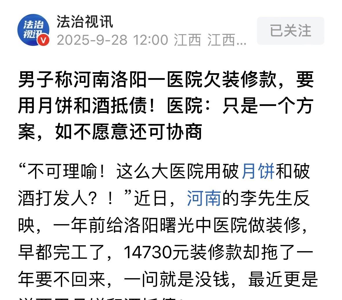 河南洛阳,男子带着工人们给一家医院装修,结果装修完院方迟迟不结14730的工钱,工人们拿不到钱很着急,男子就三番五次要钱,院方总说没钱,一拖就是一年,最后提出给他们一人发1盒月饼、1瓶酒抵消工钱,这可把男子气坏了…网友:去看病是不是也可以拿点吃的喝的抵消医疗费? 李先生最近愁得头发都快白了,他去年带着一帮工人给一家医院干装修,结果干完院方竟然不给他们结钱,14730块的工钱拖到现在还没结清。 这钱本来是给跟着自己干活的工人们发工资的,可医院方面总说“没钱”,一推就是1年。 前儿个李先生又跑去医院要钱,哪成想负责人却给了个让他哭笑不得的方案,说要不拿月饼和酒抵账? 李先生听完火更大了,说你在和我开玩笑吗?月饼也就180多块钱一盒,酒600多一瓶,我总不能提着月饼去给工人发工资吧?人家要的是钱,不是这些东西! 这事儿得从头说起。去年李先生带着施工队给医院做装修,活儿干得利利索索,完工后医院验收也通过了。 可到了结账的时候,医院就开始找各种理由推脱。李先生隔三差五往医院跑,从夏天催到冬天,又从冬天催到第二年秋天,钱就是不到位。 李先生表示,工人们跟着我干活,都是指着这钱养家糊口的。有的工人孩子开学要交学费,有的家里老人看病需要钱,我拿不出钱,他们急,我更急。 可医院那边呢?每次都说“再等等,现在资金紧张”,后来干脆提出用实物抵债。 李先生当场就拒绝了,这月饼能当钱花?酒能换钱?这不是糊弄人吗! 他越想越气,直接找了媒体曝光。记者了解情况后,当即联系医院负责人协调。 医院相关负责人解释说,确实没有强制要求用月饼和酒抵债,只是提供一个思路,如果愿意接受可以商量,不接受还可以再谈其他办法。 经过记者现场协调,双方最终达成一致,医院方面同意在10月25日前将欠款全额还清,并签订了书面还款协议。 不过这事儿还没完。李先生发现,协议上虽然有负责人签名,但没按手印。 他担心医院到时候又反悔,于是记者将情况反映给了当地12345服务热线,请求相关部门介入督促。 李先生只希望这次别再出幺蛾子了,工人们等着钱过日子呢。 目前,12345热线已转交相关部门处理,将跟进督促医院履行还款协议。 李先生的遭遇,也让人想起那句老话:欠债的是大爷,要债的是孙子。但愿这次,医院能真守信,都是工人的血汗钱,一分都不能少。 有人说,要是这样,去看病的时候是不是也可以拿个家里的特产抵医疗费啊? 医院救死扶伤,有医有药有技术,难道也生产酒和月饼?这150元的月饼和600元一瓶酒难道是用金子做的?又是从哪里来的,工人给你医院装修,挣的是血汗钱,需要的是一日三餐有保障,150元和600元是一家人几天甚至一个多月的生活保障,这用来抵工资,也太坑人了吧? 一个医院,14000多元还要去耍赖,这医院还有人敢去吗? 那么,从法律角度,怎么看待医院的行为? 《民法典》第509条规定:当事人应当按照约定全面履行自己的义务。当事人应当遵循诚信原则,根据合同的性质、目的和交易习惯履行通知、协助、保密等义务。 李先生众人与医院之间形成事实上的装修合同关系。医院作为发包方,负有按约支付装修款的义务。 根据规定,医院应当“全面履行”付款义务,包括支付金额、时间及方式均需符合约定。然而,医院拖延一年未支付14730元装修款,已构成违约。 他们提出的“以月饼、酒抵债”方案,实质是单方面变更履行方式,未与李先生协商一致,违反了“全面履行”原则。 另外,医院在李先生多次催讨后仍以“没钱”推脱,没有履行诚实信用义务,加剧了合同履行的不确定性。 《保障农民工工资支付条例》第3条规定:农民工有按时足额获得工资的权利。任何单位和个人不得拖欠农民工工资。建设单位应当按照合同约定及时拨付工程款,并将人工费用及时足额拨付至农民工工资专用账户,加强对施工总承包单位按时足额支付农民工工资的监督。 李先生作为装修工程承包人,他雇佣的工人工资受该条例直接保护。医院拖欠的14730元装修款,本质是工人工资的来源之一。 根据《条例》第3条,医院作为建设单位,负有“及时拨付工程款”的法定义务,且需确保人工费用优先用于支付农民工工资。 然而,医院拖延付款导致工人工资无法发放,已违反“不得拖欠农民工工资”的强制性规定。即便医院提出“以物抵债”,也因该方案无法直接变现支付工人工资,实质上侵害了农民工的合法权益。 对于这件事,你怎么看? 信源:法治视讯 2025-9-28 欢迎关注@一案一论 #头号创作者激励计划#