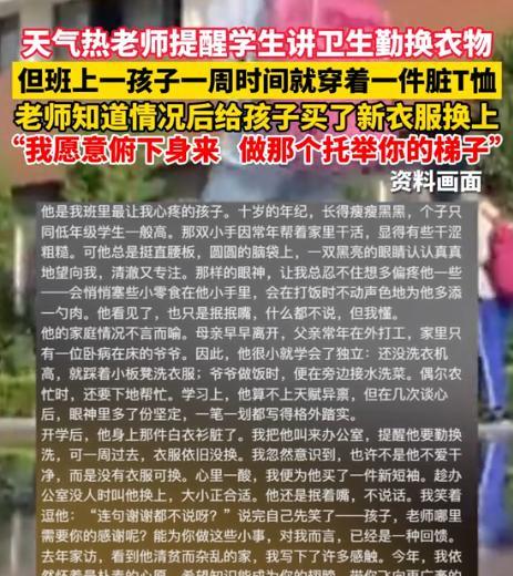 近日,重庆开州,一名女老师把小男孩叫到办公室,提醒他身上的T恤衫脏了,可一周过去了,衣服还是没换。老师这才意识到,他不是不爱干净,而是没有衣服可换。 小男孩叫小宇(化名),十岁,黑瘦瘦的,上课总是挺直腰背,显得很认真,但他身上的白色T恤脏得看不出原来的颜色,领口还有洗不掉的污渍。 那天午休,刘老师叫他到办公室,尽量轻声说:“小宇,天热容易出汗,该换件干净的衣服了。” 小宇低着头,“嗯”了一声就快步走开。 刘老师当时没多想,以为孩子忘了或者不在意干净,可一周过去,衣服还是脏兮兮的,还沾上新的墨渍。 直到某次课间,刘老师看到小宇躲在走廊角落,用袖子擦桌上的墨水,擦完还赶紧把手背到身后,老师才意识到,孩子根本没有干净衣服可以换。 放学后,她单独找小宇聊天,没有追问衣服的事,只是随口问起家里情况。 小宇慢慢说,妈妈在他记忆里就不在了,爸爸为了生活和给爷爷看病常年在外打工,家里就剩下瘫痪的爷爷和他。 每天回家,小宇先帮爷爷倒水洗漱,再踩着小板凳做饭、洗衣服,衣服湿了只能晾干再穿,也从不抱怨。 第二天午休,刘老师去超市挑了一件短袖,选了宽松尺码,想着孩子还能穿久一点。 办公室没人时,她轻声叫小宇进来:“试试这件合不合身,多穿也不会浪费。” 小宇手捧着衣服有些发抖,慢慢换上,局促地拽着衣角。 刘老师平时心疼都藏在日常里。 有次家访,刘老师推开土坯房的门,心都酸了。 爷爷躺在床上哼哼,小宇踩着板凳给爷爷喂水,旁边盆里泡着全家的衣物,他的小手干涩粗糙,不像同龄孩子。 这件事传到网上,很多人都被感动。 网友说,最暖的不是那件衣服,而是老师没有戳破孩子的难处,把关心藏在“多带一份”“买错尺码”的小动作里,保护了孩子的自尊。 刘老师说:“我做的都是小事,但看到孩子笑,我就觉得值得。” 现在小宇每天穿着干净的短袖上学,上课更专注了,有时还会主动举手回答问题。 教书育人,不只是口号。老师的一点细心、一点关心,就能在孩子心里种下温暖,让他们在风雨里慢慢扎根,长成参天大树。 对此你怎么看? 信源:大象直播间