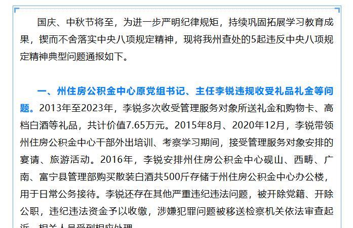 当我们看到落马干部的贪腐行为时,每每让我们错愕的,都是动辄数千上亿,甚至是数亿上十亿的涉案财物,或者数百上千套房产,我们惊讶于数额上限的不断突破。 但这次让人错愕的,居然是因为贪污财物的“寒酸”。近日,文山州公布了5起违反中央八项规定精神典型问题,包括州住房公积金中心原党组书记、主任李锐违规收受礼品礼金等问题。 通报称,李锐在2013年至2023年担任文山州住房公积金管理中心主任期间,收受礼金、购物卡和高档白酒共计7.65万元,平均下来一年还不到8000元,在见过了各种“大世面”之后,网友们表示不 敢相信。 更让人瞠目的是,李锐还安排下属在办公楼存了500斤散酒,而且这些酒还是分别从砚山、西畴、广南、富宁县四个管理部买的。不喝精美包装的高档酒,却喝起了价格不会过高的散酒,也难怪网友感叹过于“节俭”。 通报称这些酒用于日常公务接待,也就是说,这引起酒基本上都用于了公款吃喝上,我们按照每桌每餐喝5斤的量来计算,500斤散酒就要公务招待100桌以上。那么问题来了,这些所谓的公务招待,到底有多少是真正的公务,多少是打着公务招待的幌子大吃大喝呢?在查处李锐的同时,不知道查没查这个问题,算一算这笔账。 生于1973年的李锐,不到18岁开始参加工作,由此可见学历不会太高,最高也就是高中或中专水平。但这丝毫不影响他提拔,他先后在麻栗坡县政府办公室当过副主任,后又调入州建设局担任办公室主任,2013年升任州住房公积金管理中心主任,2019年被明确为正处级。 当了多年办公室主任的李锐,看来在吃喝招待上,还是颇有“研究”的,能把500斤散酒放在办公楼,他也是奇葩一朵。 #头号创作者激励计划##官方通报干部买500斤散酒放单位接待#