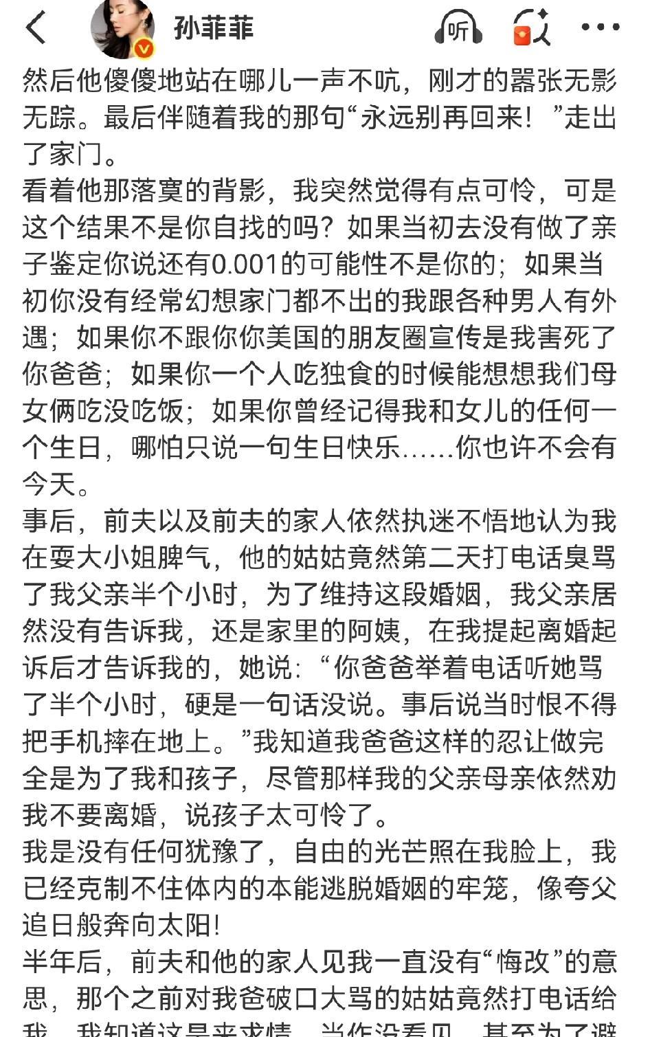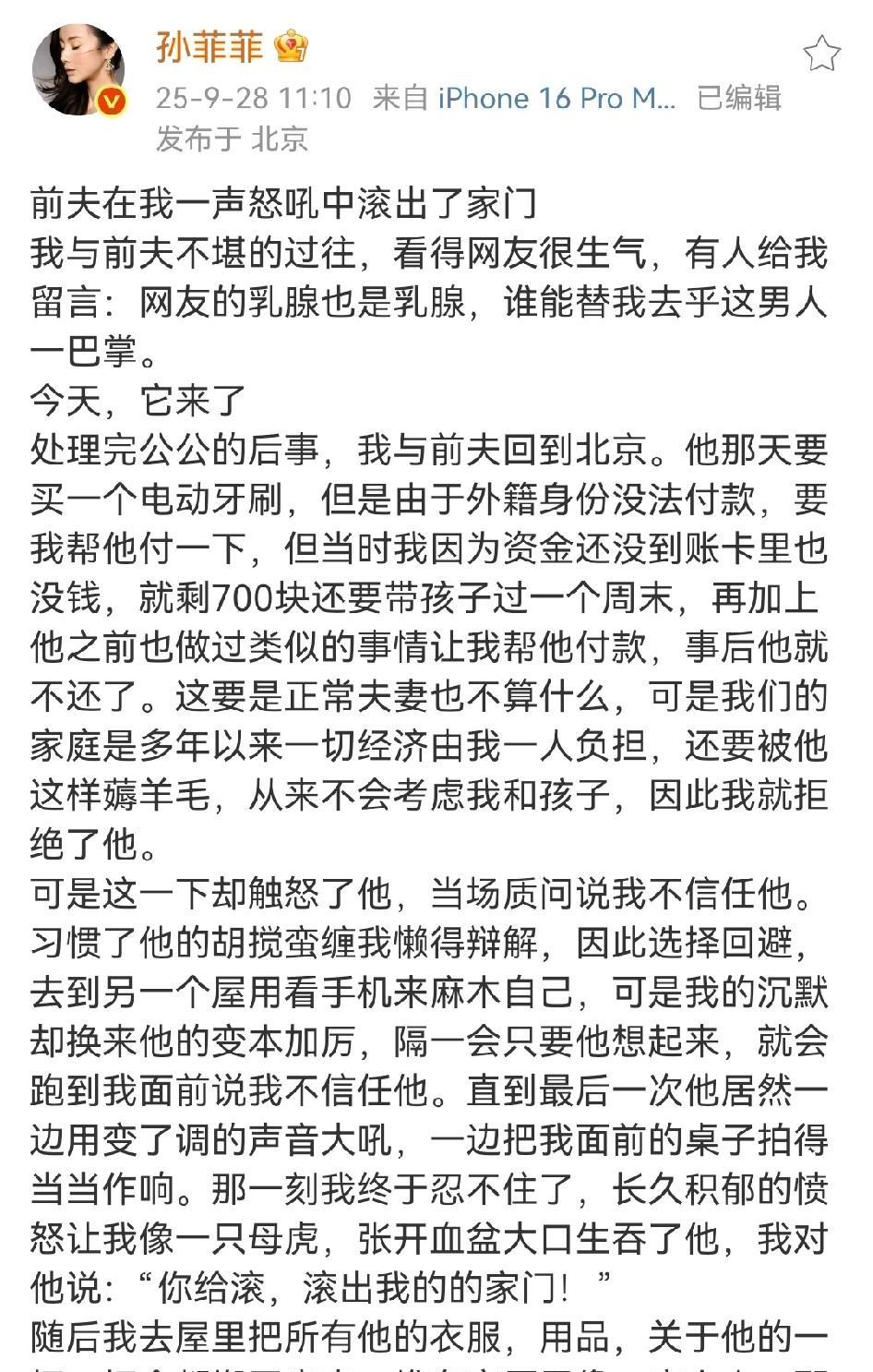 孙菲菲:“让我下定决心我和前夫离婚的事情是,我身上只剩下700块钱了,他还要让我帮他付买电动牙刷的钱,我拒绝了,他就暴怒找我吵架,说我不信任他,我当场就崩溃的怒吼让他滚出我的家,他和他的家人还觉得我在闹脾气,他的姑姑给我爸打电话,骂了我爸半个小时,后面知道我动真格的,又来求我,但我心死了,就变得无坚不摧了!” 孙菲菲和史宏结婚后就没拍过戏了,而这些年整个家都是她在养着,花的都是以前的积蓄,她虽然心有不满,但一直任劳任怨的出钱出力。 之所以会爆发,是因为史宏明明有工作,有收入却不愿意拿出来,买个电动牙刷还想从她这里扣钱,而她当时资金流转问题,身上只有700块钱,是她和女儿一周的生活费,所以才拒绝了史宏,史宏则像以前那般,道德绑架她,攻击她,然后矛盾就升级成离婚了。 小编觉得孙菲菲是不幸的,也是幸运的,不幸的是,她所嫁非良人,找老公的眼光太差了,导致她的人生被毁了十几年。 幸运的是,她是有经历能力的,房子是她的,要不然吵架的时候,就是她被赶出去,而不是她把史宏赶出去了。 而网友们之所以很难共情孙菲菲,是因为孙菲菲的条件明明那么好,也有无数次机会离婚走人,可她却硬忍了十几年,这在网友们看来就是自找苦吃,没什么可同情的。