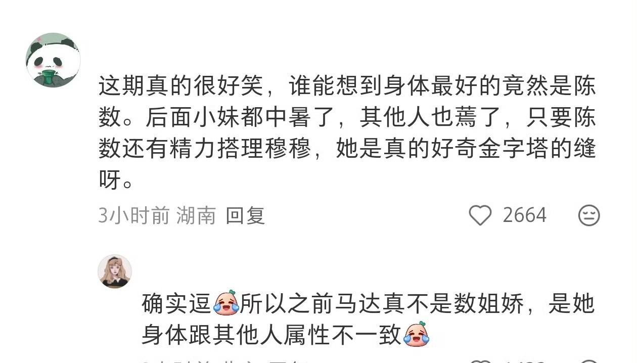 谁能想到呢, 埃及的高温 给陈数正名了! 最新的一期《花少》大家看了吗?埃及40多度的高温下,花少团几乎所有人都被晒蔫了,就连一向动力十足的小太阳张雅琪都中暑了,但唯独陈数,似乎到了自己的舒适区。 怕冷不怕热前两期感觉她身体可能不较弱吧,谁能想到现在一到40度的埃及,就她最是生龙活虎了。不仅突破自我挑战滑翔伞,还连喝了好几杯冰可乐,最后就只有她还能和穆穆social了。 前几期还有很多人吐槽她这身子骨何必来这个节目,没想到是气温的问题。但问题来了 ,她们马上去北欧了,数姐不知会不会又要关机了 ?