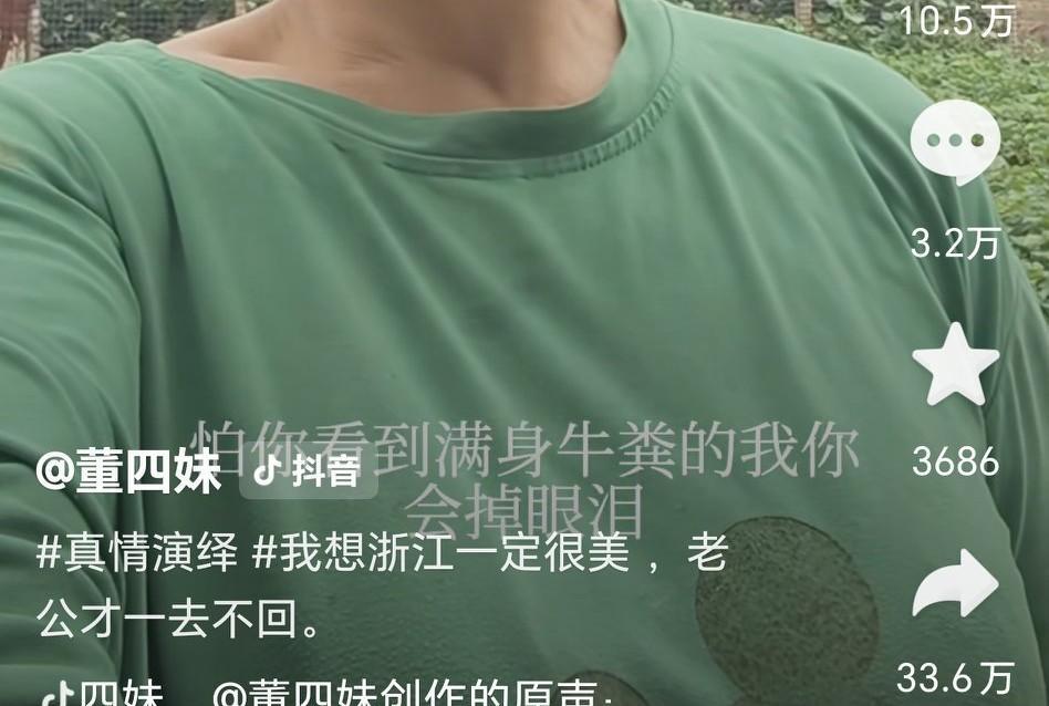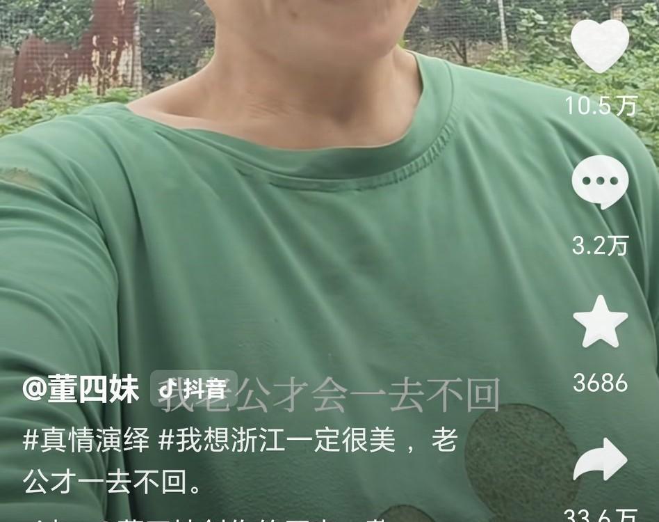 唱出浙江省歌的“董四妹”竟然才36岁,农村干活妇女真的显老。她唱歌是真的好听啊,希望不是对口型。来来去去就两首歌:一会儿找老公,问他为何去浙江不回家了,浙江一定很美;一会儿问哪个舅子来看她,送瓶水来给她喝,尽显干农活的苦楚,满脸泪水汗水……