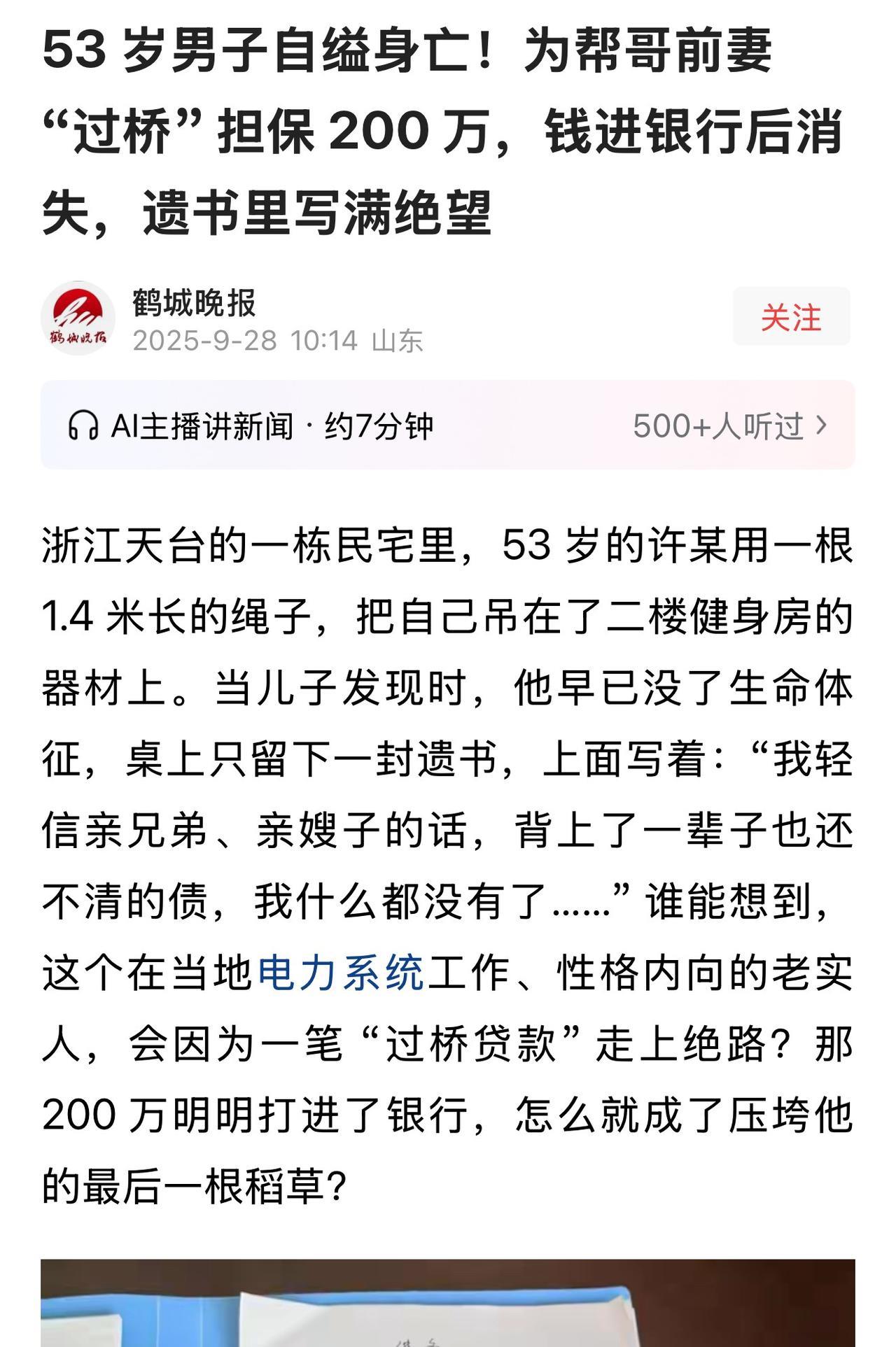 浙江天台,53男子,被嫂子拉去为“过桥贷款”签字,遭银行经理与嫂子算计,背负400多万债务,走投无路之下,上吊自缢。事后,其哥哥说:早知道,就算砸锅卖铁也要和弟弟一起扛!网友:能伤害你的,往往是你最亲的人。 53岁的许某,在当地电力系统上班,心地善良,性格又好。 本可以安安稳稳过一生,却没想到,被前嫂子拉下水,卷进“过桥贷款”里,搭上了自己的命。 2025年3月,许某和他嫂子徐某群一起来到银行。(彼时,徐某群已经与许某哥哥离婚。) 徐某群银行有笔150万贷款要到期,按规矩得先还本金才能续贷。 徐某群凑不出钱,就找了银行客户经理金某意,想借“过桥资金”。 所谓的借桥贷,就是先借高息钱还银行,续贷下来再还回去,通常就用一天,可利息高得吓人。 金某意给她推荐了放贷人潘某,还拍胸脯保证:你跟你妹徐某霞互相担保,许某就能脱保了。 这话一出,正合许某心意,这150万贷款,之前是由许某进行的担保,考虑哥哥和嫂子已经离婚,他也不想再牵扯其中,不做担保人是他求之不得的。 3月26 日,徐某群向潘某借 150 万,用一天,利息 22500 元,但需要许某和妹妹徐某霞做担保。 许某一开始有些犹豫,但架不住徐某和金某意的劝说。 想着,反正一天贷款就下来了,就能摆脱担保了人的身份了,于是,在共同借贷上签了字。 3月27号早上,徐某群顺利拿着150万去银行续贷。 金某意却意突然变卦,说:不够,得再补50万,先还你徐某霞的贷款,她的也到期了。 徐某群一头雾水,问道:我妹妹的的贷款5月底才到期,她人还在台湾治病,回不来。 金某意又说:你先把她的还了,银行放出来再还你的,利息还能降。 徐某群被说动,又找潘某借了50万,利息涨到3万一天。 随后,她赶紧把200万转到妹妹账户。 金某意又告知:过个账,你们姐妹俩的续贷一起办! 结果钱一转过去,就石沉大海了。 徐某群在银行楼下冒雨等了一天,金某意各种接口推脱,到下班也没办上。 接下来一周,许某、徐某群、潘某天天跑银行,得到的答复永远是“正在处理”! 直到这时他们才发现,被骗了!徐某霞没到期的贷款被银行提前扣了,徐某群的续贷,压根就没批下来! 许某彻底慌了,他不但没脱保,还平白多了200万高息借款的责任。 潘某见不回钱,直接把徐某群、许某、徐某霞告上法院。 5月27号开庭,徐某群不敢去,徐某霞在台湾没露面,就许某一个人孤零零站在法庭上。 许某一口咬定这是欺诈,可拿不出证据,法院判他和徐某群共同还147万本金加利息(已扣掉 3 万利息)。 没等许某喘息过来,6月24号、25号,他又收到银行的支付令,要他还另外265万贷款。 短短两天,身上就扛上了400多万债务,他找徐某群要个说法。 毕竟这都是为了帮她才惹上这么多的债务。 可徐某群根本不接电话。 许某实在没辙了,就去找哥哥,可哥哥只是口头承诺他来还,却拿不出来钱。 6月26号晚上,许某越想越憋屈,这么多的债务他无力偿还,竟有了轻生的念头, 随后,他找来一根1.4米长的绳子,把自己吊在二楼健身房器材上,结束了司自己的生命。 同时留下一份遗书:我轻信亲兄弟、亲嫂子的话,背上了一辈子也还不清的债,我什么都没有了….. 许某妈妈知道这个噩耗后,悲痛欲绝,称徐某在离婚后心情就不好,这些债务是压死他的最后一根稻草。 哥哥也自责:早知道砸锅卖铁也该帮他还,不该让他一个人扛。 但是,说这话为时已晚。 《刑法》第193条明确规定:以非法占有为目的,诈骗银行或者其他金融机构的贷款,数额较大的,处五年以下有期徒刑或者拘役,并处二万元以上二十万元以下罚金;数额巨大或有其他严重情节的,量刑更重。 具体到案件中,金某意的行为存在多个符合该罪名构成要件的争议点: 其一,他明知徐某群无偿还能力、需依赖“过桥贷”续贷,却主动推荐放贷人潘某,还以“许某能脱保”为虚假承诺,诱骗许某以“共同借款人”身份签字,本质是通过欺骗手段促成借款; 其二,他临时变卦要求追加50万,谎称“先还徐某霞贷款再续贷、利息能降”,可实际徐某霞贷款未到期、人在台湾,且200万转入后既被银行提前扣划,徐某群的续贷也未审批。 若后续能查实金某意对“续贷无法审批”知情,或存在与他人串通转移资金的行为,即可认定其具有“非法占有目的”,符合贷款诈骗罪的核心要件。 不过,事后监管部门以“证据不足”未认定该行为,核心问题在于缺乏金某意主观故意的直接证据(如录音、书面沟通记录)。 认定银行“提前还贷没确认意愿、续贷没说条件、信息保护有问题”,可对“欺骗收贷、违规推荐过桥资金”,却以“证据不足”不认。 徐某群不服,再申请问责,至今没答复。 最后,潘某跟徐某霞和解了:徐某霞还68万,潘某就不追究她和许某,也不强制执行徐某群。