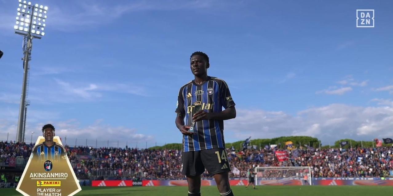 意甲第五轮:比萨0:0佛罗伦萨 阿金桑米罗荣获本场最佳球员,国际米兰外租尼日利亚中场小将正在走向成熟! 内拉祖里的目光投向了在卡利亚里客场打入一球的皮奥·埃斯波西托,而在刚刚结束的一场比赛中,同样有国际米兰青训小将发挥出色,他就是20岁的尼日利亚小将阿金桑米罗! 先看看阿金的经历: 2023年1月,那年冬窗转会期,国际米兰U19签下了尼日利亚雷默之星队年轻小将埃比尼泽·阿金桑米罗,转会费据说47万欧元! 2024年2月26日,19岁的中场球员埃比尼泽·阿金桑米罗今天在意甲联赛中代表国际米兰对阵利切,完成了自己的职业首秀。 2024/2025赛季,阿金加盟意乙桑普多利亚,出场38次17次首发1球1助攻,稍逊皮奥·埃斯波西托; 2025年7月,阿金桑米罗从国际米兰租借加盟升班马比萨,附带买断条款和反买断条款! 比萨足球俱乐部正如预计的那样,将为阿金桑米罗提供理想的平台,让他在战术和身体素质上不断成熟,主教练吉拉迪诺踢的是352阵型,中场倒三角站位,也就是两个后腰保护,阿金是偏左的那个后腰,本赛季已经出场4次3次首发! 作为国际米兰后腰备选人才储备之一,需要面对斯坦科维奇的竞争,也需要面对其他优秀球员的竞争,因为明年恰尔汗奥卢不一定留队了,需要有人可以接手后腰位置!