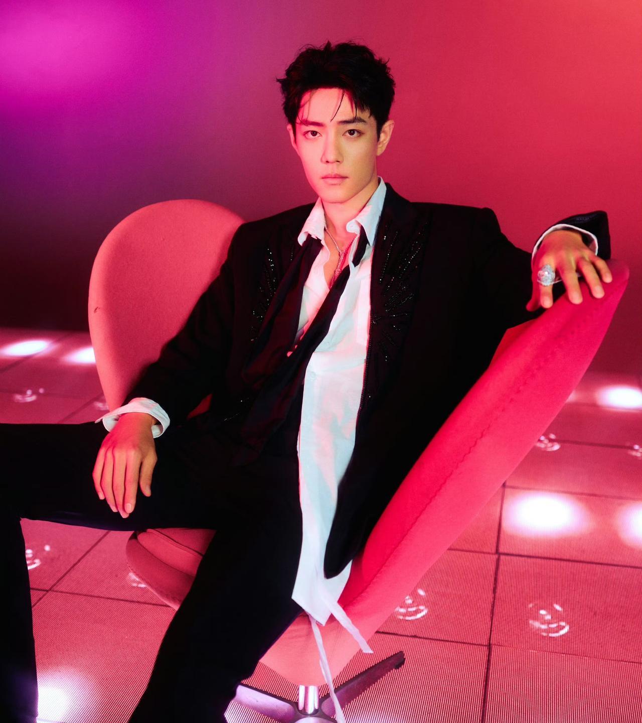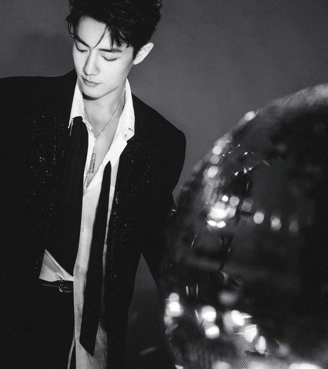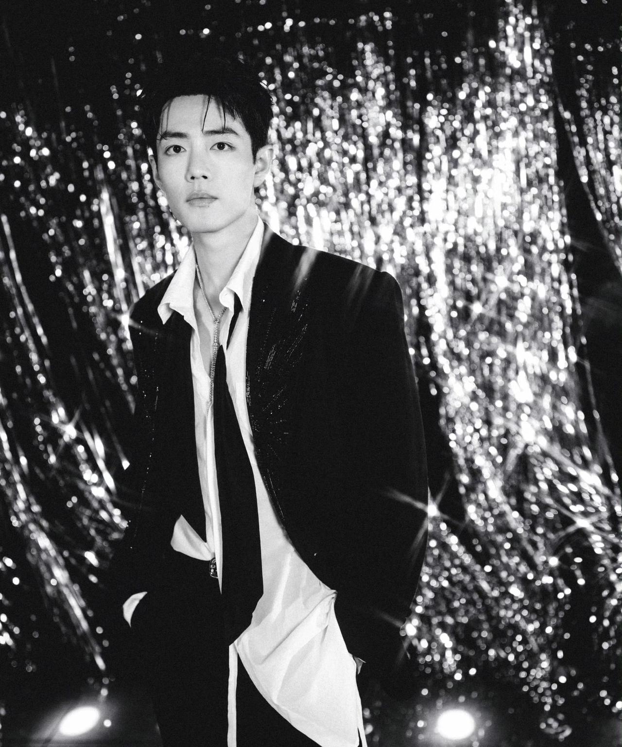 肖战出席2025大湾区电影音乐晚会造型大片,身着串珠刺绣西服套装搭配衬衫和领巾,