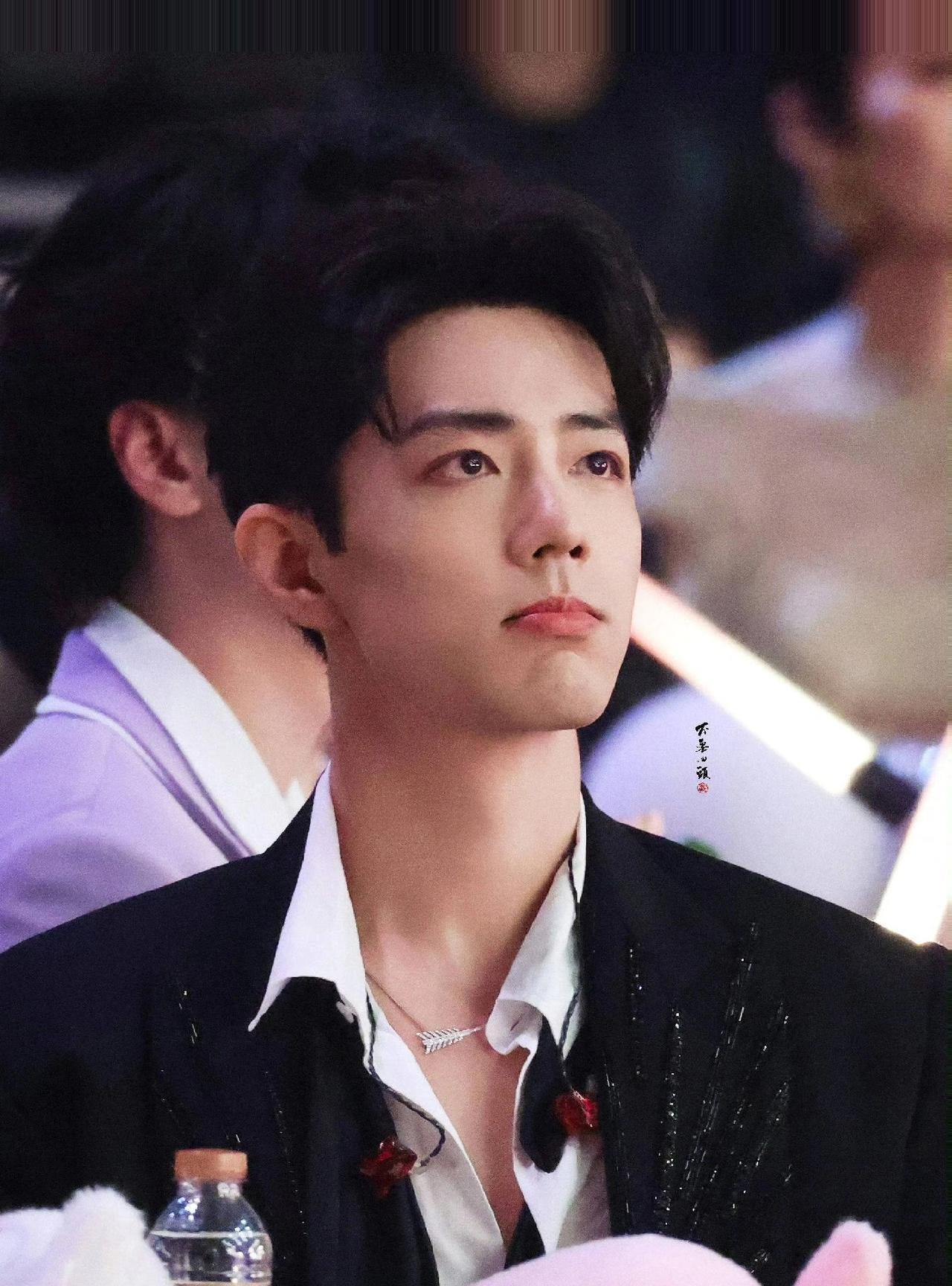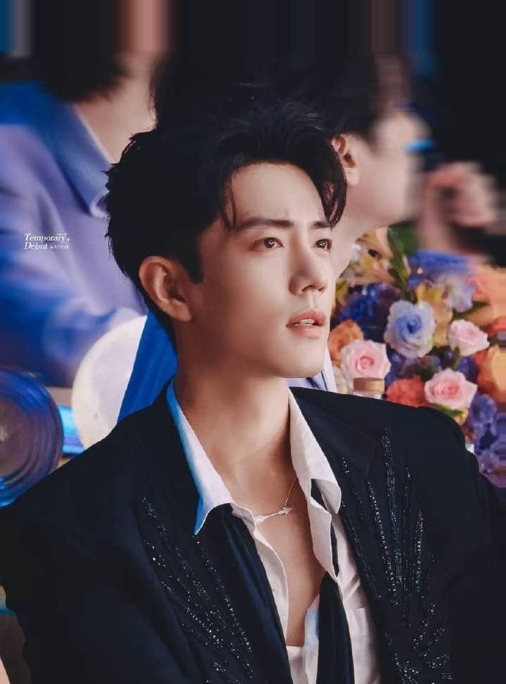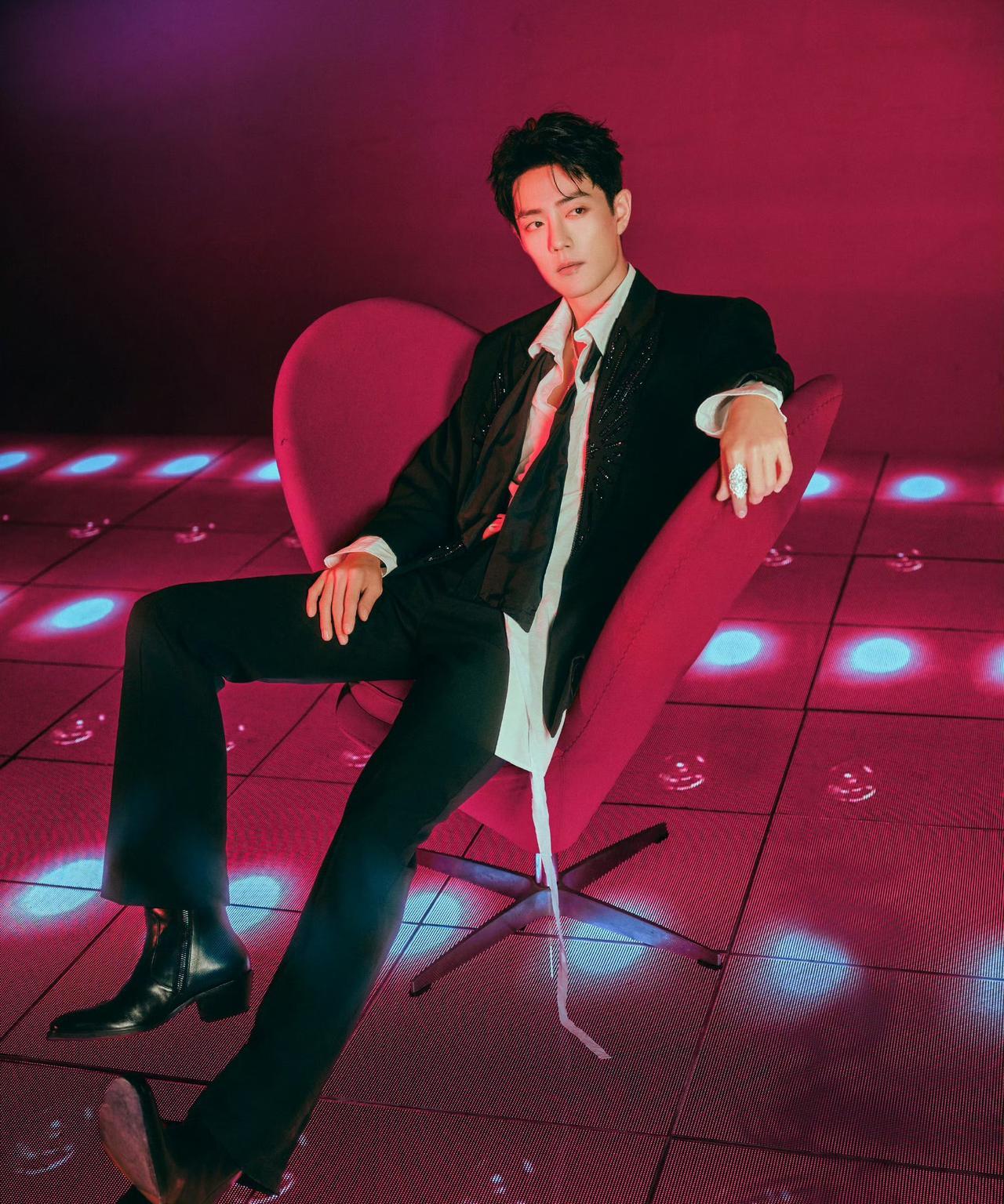 肖战出席2025大湾区电影音乐晚会造型大片,身着串珠刺绣西服套装搭配衬衫和领巾,